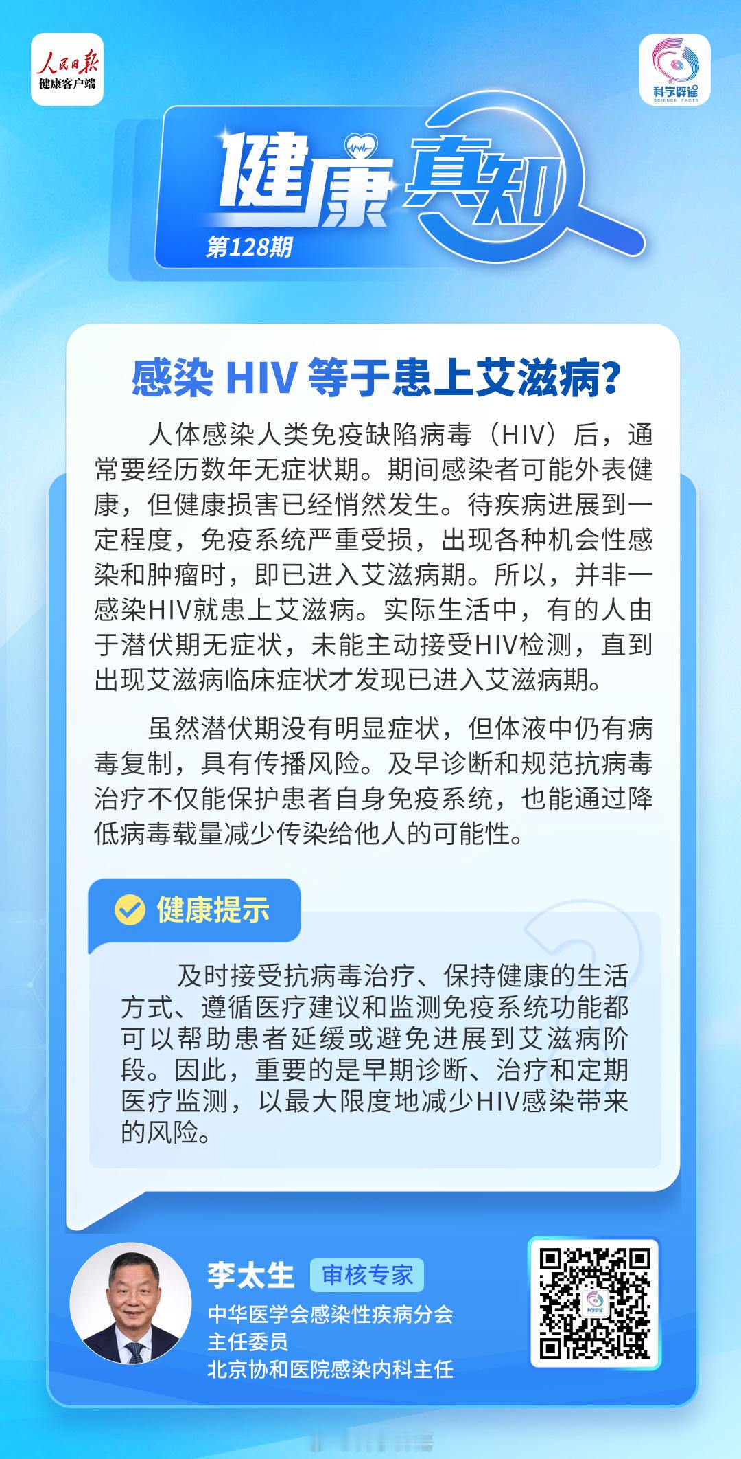 健康真知 【感染 HIV 等于患上艾滋病?】人体感染人类免疫缺陷病毒(HIV)后,通常要经历数年无症状期。期间感染者可能外表健康,但健康损害已经悄然发生。待疾病进展到一定程度,免疫系统严重受损,出现各种机会性感染和肿瘤时,即已进入艾滋病期。所以,并非一感染HIV就患上艾滋病。实际生活中,有的人由于潜伏期无症状,未能主动接受HIV检测,直到出现艾滋病临床症状才发现已进入艾滋病期。健康辟谣行动