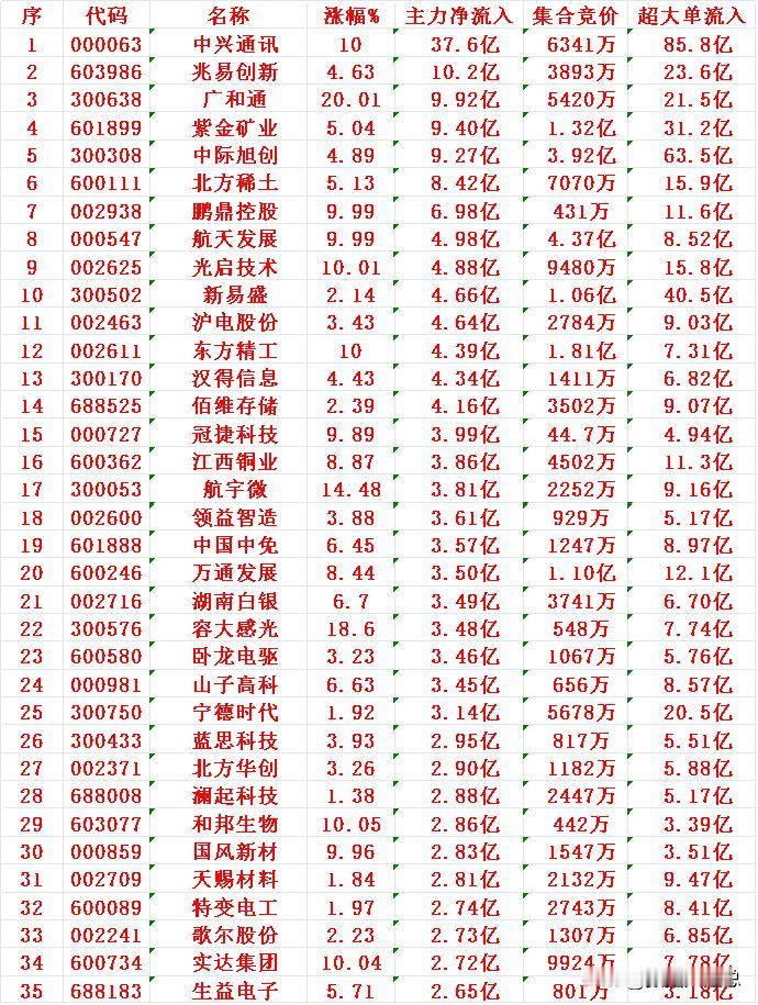 12月1日尾盘30分钟,主力资金“大幅抢筹的”35名单一览! 中兴通讯:净流入 37.6亿元,超大单流入 85.8亿元 兆易创新:净流入 10.2亿元,超大单流入 23.6亿元 广和通:净流入 9.92亿元,超大单流入 21.5亿元 紫金矿业:净流入 9.40亿元,超大单流入 31.2亿元 中际旭创:净流入 9.27亿元,超大单流入 63.5亿元 北方稀土:净流入 8.42亿元,超大单流入 15.9亿元
