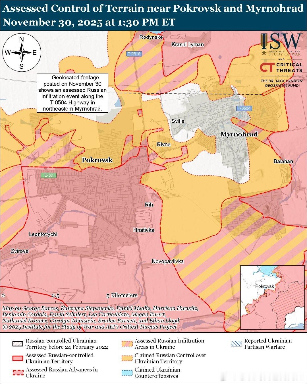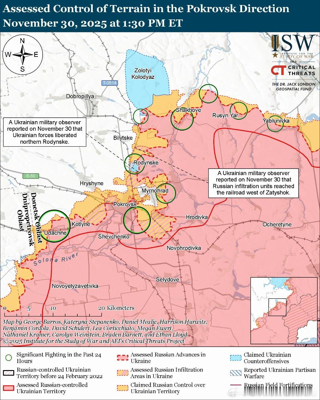 由于俄军阵地战推进速度缓慢,因此俄军夺取波克罗夫斯克的行动旷日持久且代价高昂。尽管俄军已在波克罗夫斯克城内占据阵地超过120天,但仍未能完全占领该城。乌克兰军事观察员马绍韦茨于11月30日报告称,乌克兰军队在反击中将俄军逼退至罗丁斯克南部郊区。马绍韦茨补充说,波克罗夫斯克城内代价高昂的城市战削弱了俄第51合成集团军(南部军区),迫使俄军指挥部将相对精锐的第336海军陆战旅(波罗的海舰队)和第155海军陆战旅(太平洋舰队)投入到邻近的科斯蒂安蒂尼夫卡-德鲁日基夫卡战术区,以支援第51合成集团军在卡泽尼托列茨河以西(波克罗夫斯克东北部和多布罗皮利亚东南部)以及新经济城-米尔诺赫拉德方向(波克罗夫斯克东部和北部)的作战行动。马绍维茨指出,俄军无法将装甲车辆运过卡泽尼托列茨河到达其位于河西的据点,迫使俄军步兵在该据点孤立作战,进一步限制了俄军在波克罗夫斯克包围圈东北侧的推进速度。11月29日和30日公布的地理定位视频显示,乌克兰军队在博伊基夫卡以东、潘基夫卡以南和新托列茨克以西(均位于多布罗皮利亚东南)对试图渡过卡泽尼托列茨河的俄军架桥车和装甲战车进行了打击。11月28日一名在波克罗夫斯克方向作战的乌军副营长表示,俄军没有充分利用其在无人机和兵力方面的数量优势,俄军在波克罗夫斯克的存在并非乌克兰军队撤出该镇的理由。11月30日在波克罗夫斯克方向作战的乌军旅发言人报告说,俄军在第一波进攻中派出了训练不足、新招募的人员,随后又派出了训练相对更好的人员。然而波克罗夫斯克方向的局势依然严峻。马绍韦茨评估认为,俄军在切尔沃尼(克拉斯尼)莱曼(波克罗夫斯克东北部)以南以及波克罗夫斯克和米尔诺赫拉德之间的区域的存在,将迫使驻扎在米尔诺赫拉德的乌克兰军队进行战斗撤退,以避免被包围。一位在波克罗夫斯克方向作战的乌军副营长报告称,俄军控制了波克罗夫斯克至少一半的地区,俄军的兵力优势将使乌克兰军队难以完全夺回该镇。一位在波克罗夫斯克方向作战的乌军旅发言人报告称,浓雾持续削弱乌克兰无人机的侦察能力,俄军正在使用(FPV)、闪电(Molniya)无人机、固定翼无人机和潜伏无人机来封锁乌克兰的地面交通线。