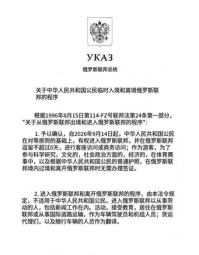 哇!从今天起至2026年9月14日(含9月14日)止,大家可以免签证以旅游和商务目的前往俄罗斯。免签天数为30天。可以去俄罗斯拍游记了~俄罗斯免签