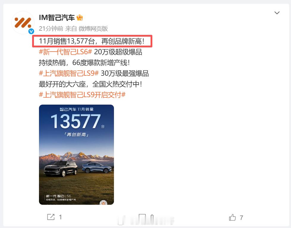 我一直认为智己是有不少潜力变成新势力小黑马,现在的智己LS6+LS9= 明暗两条主线,既冲量也冲形象,11月的销量体量到了新高度,智己汽车公布11月销售13,577台。大v聊车