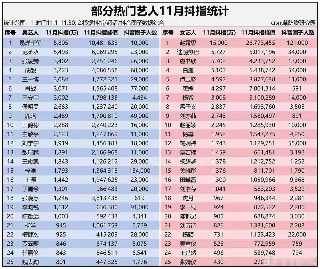 11月女艺人抖指统计榜单,赵露思抖指数1.5亿断层领先第一,全方面的碾压,爆剧女王的实力!