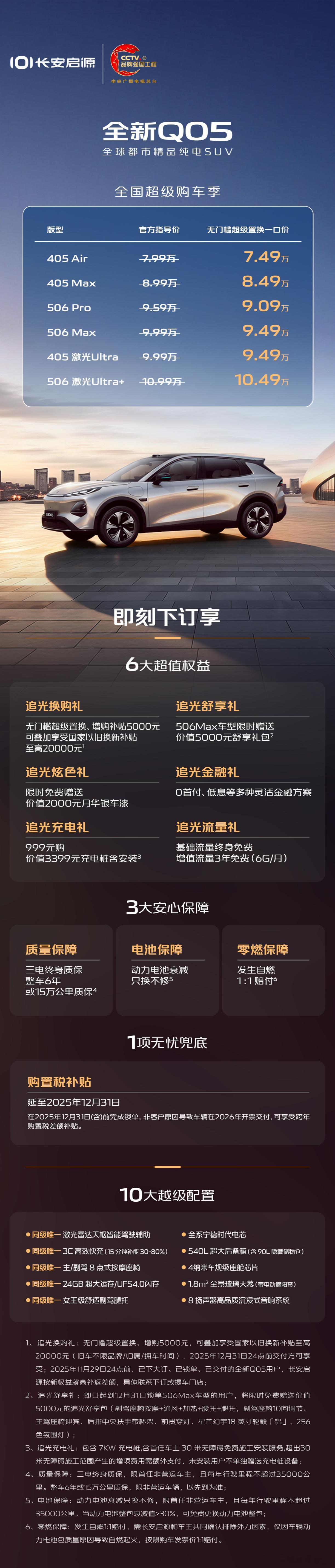 11月29日,长安启源全新Q05开启超级购车季,并宣布全面刷新用户购车权益,涵盖整车及三电系统的“三大安心保障”、购置税兜底政策延续至12月31日。同时,重磅推出全系无门槛超级置换、增购一口价,立省5000元,低至7.49万元起。全新Q05率先将激光雷达配置破级下放至10万级市场,是10万内唯一激光雷达纯电SUV。全新Q05激光版搭载1颗激光雷达+3颗毫米波雷达+12颗超声波雷达+11个摄像头,全车一共27个传感器,共同组成同级最高配置水平的感知系统,再加上地平线征程6M芯片,拥有高达128Tops的超强算力,让智能驾驶辅助更安全更便捷。智能泊车辅助,平均用时26秒,比老司机还快。Q05全系标配宁德时代电芯,搭载长安自研“金钟罩”电池2.0技术,提供405km与506km两种续航选择,在行业先进的热管理控制策略下,能在低温环境下依然保持高效制热,避免续航大幅缩水;3C超充让电量从30%充至80%仅需15分钟,5分钟可补充120km续航。新车尺寸4435*1855*1600mm,轴距2735mm。首搭台积电天玑P1 Ultra 4nm车规级芯片,配合24GB运行内存、UFS 4.0闪存,组成“性能铁三角”,并率先支持5G网络,搭配15.6英寸2.5K超清中控大屏,融合AI大模型,实现可见即可说、连续对话的智能交互。值得一提的是,长安启源全新Q05还是同级唯一同时支持全部手机互联的车型,包括HUAWEI HiCar、Carlink、CarPlay等,并且车机内置高德+百度双地图,以及网易云音乐、优酷、喜马拉雅等主流应用,还能连接海尔、美的等家电生态,实现车家互联。全球都市精品纯电SUV