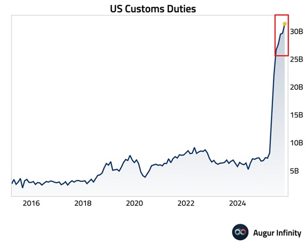 美国10月关税收入同比激增281%,达创纪录的342亿美元在截至10