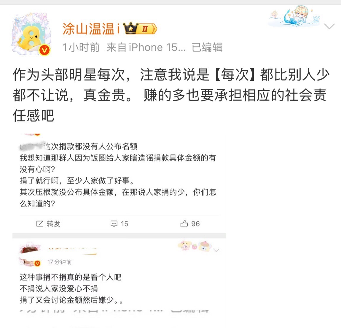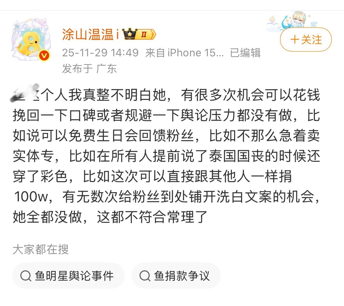 看的出来温如也是离开微博估计就没收入了!不然也不会这么执着!她这次禁言估计是嘲明星在一些灾害事件捐款捐的不多,真的就离谱!