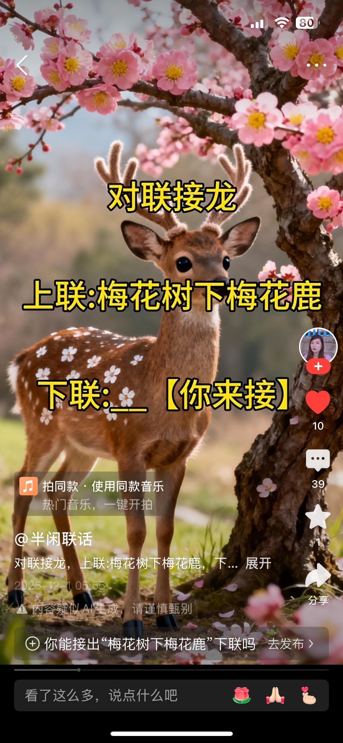 梅花树下梅花鹿, 大渡河中大渡桥。 横批:《树鹿河桥》