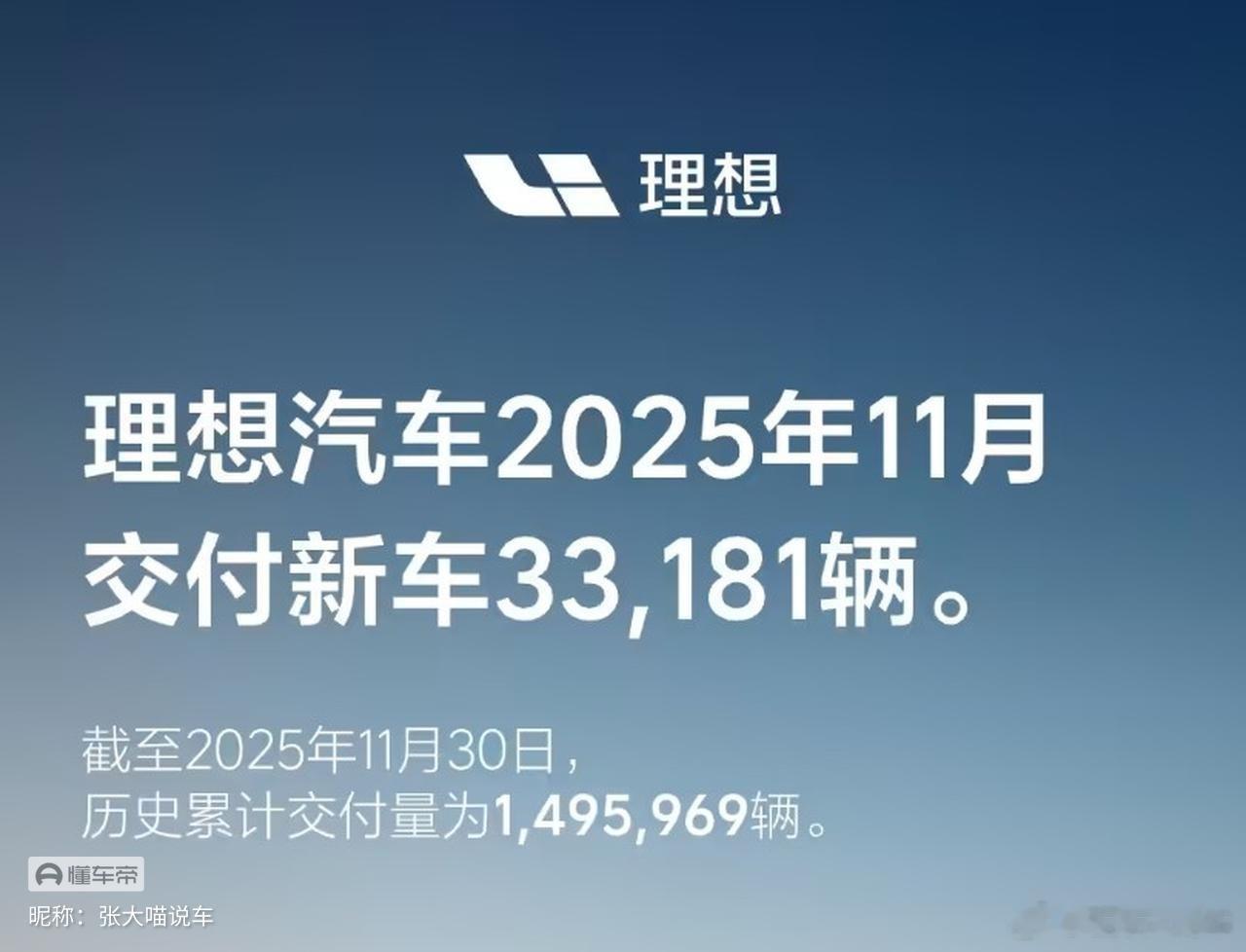 左右观车 【哪家强?11月销量快报:理想汽车交付33181辆,同比下滑31%!比亚迪、鸿蒙智行、零跑汽车、极氪汽车、小米汽车等也公布了销量】2025年11月汽车销量快报:理想汽车——11月交付33181辆,同比下滑31%(去年同期11月销量48740辆)。理想汽车翻身难,主要对手鸿蒙智行明年要上20多款新车,从十几万的小车到上百万的MPV,从增程到纯电全覆盖,对手太强了。比亚迪——11月销售48.02万辆,同比下降5.24%;累计销售418.20万辆,同比增长11.30%。鸿蒙智行——11月汽车销量81864辆,同比增长89.6%,单月交付创历史新高。零跑汽车——11月销量70327辆,同比增长75%。小米汽车——11月销量超40000辆,连续三个月交付破4万。吉利汽车控股——11月销量310428辆,同比增长24%,包含出口42091辆。岚图汽车——11月销量20005辆,同比增长84%。今年前11个月累计销量13.4万辆,同比增长82%。猛士汽车——11月销量2007辆,环比增长38.4%。东风风行——11月销量10191辆,同比增长30%智己汽车——11月销量13577辆,连续三个月交付破万,创历史新高。上汽大通——11月国内外销量26193辆,同比增长67%。上汽集团——今年1-11月累计销量410.8万辆,同比增长16.4%。极石汽车——11月销量1452辆。