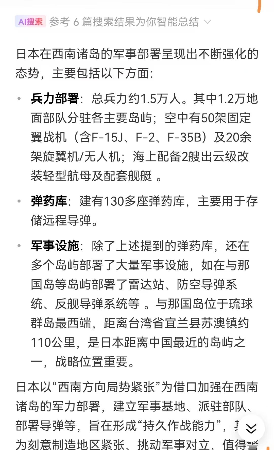 小心!!小心!! 高市早苗在悄悄整顿军备! 日本在台湾附近部署了军事基地! 日本一面反对高市早苗的错误言论,一面又积极推进军备,在台湾西南110公里诸岛部署导弹! 现在诸岛部署的兵力1.5万人了,空中有F15、F2和F35B及二十多架无人机!还建有130多座弹药库,储存中远程导弹! 日本这一行为严重威胁了我国,对我国统一台湾也是不确定因素! 日本以“西南方向局势紧张”为借口,在离我们台湾如此近的地方,建立军事基地、派遣部队、部署导弹!要格外警惕! 大家对此怎么看呢?