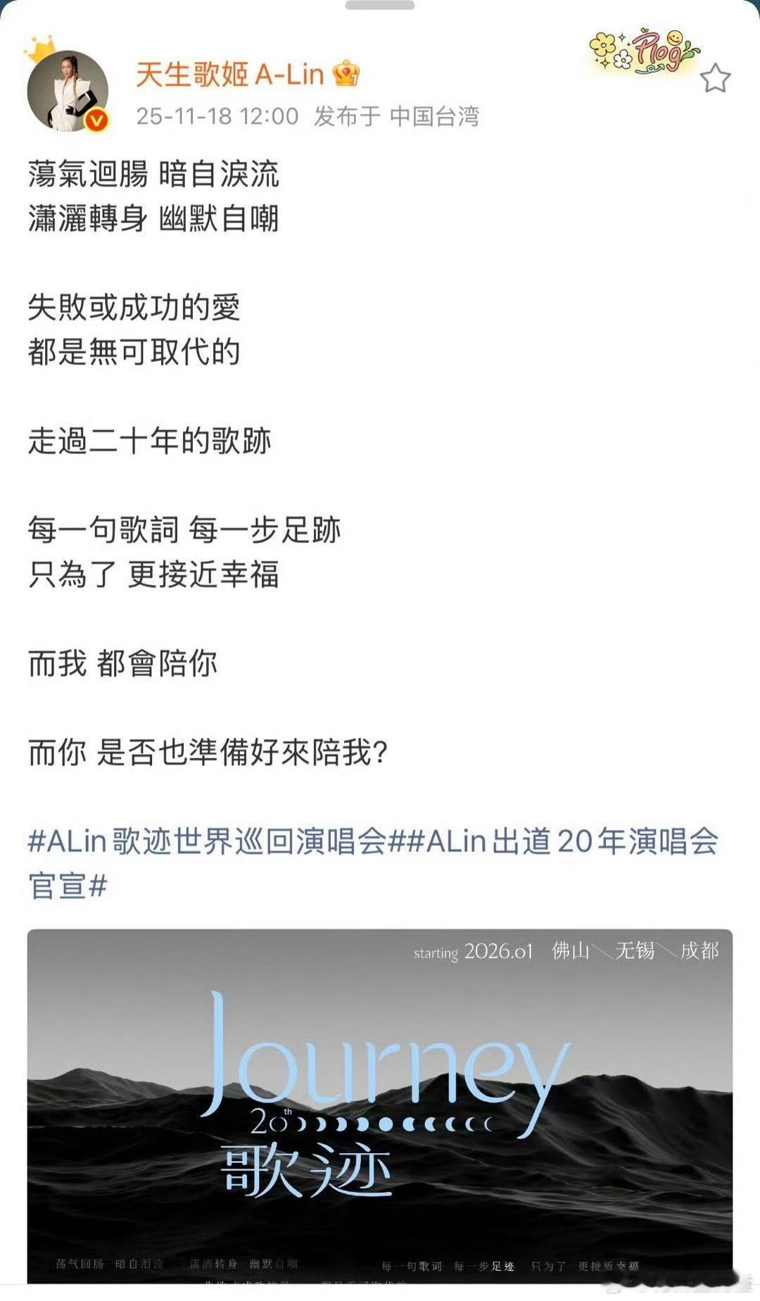 天生歌姬把歌迹抬上来了 A-Lin「歌迹」巡演福利加码!佛山1.24-25日、无锡1.31-2.1日持续开唱,出道20年唱功在线不打折,治愈又有感染力的现场,歌迷速速锁票赴约~