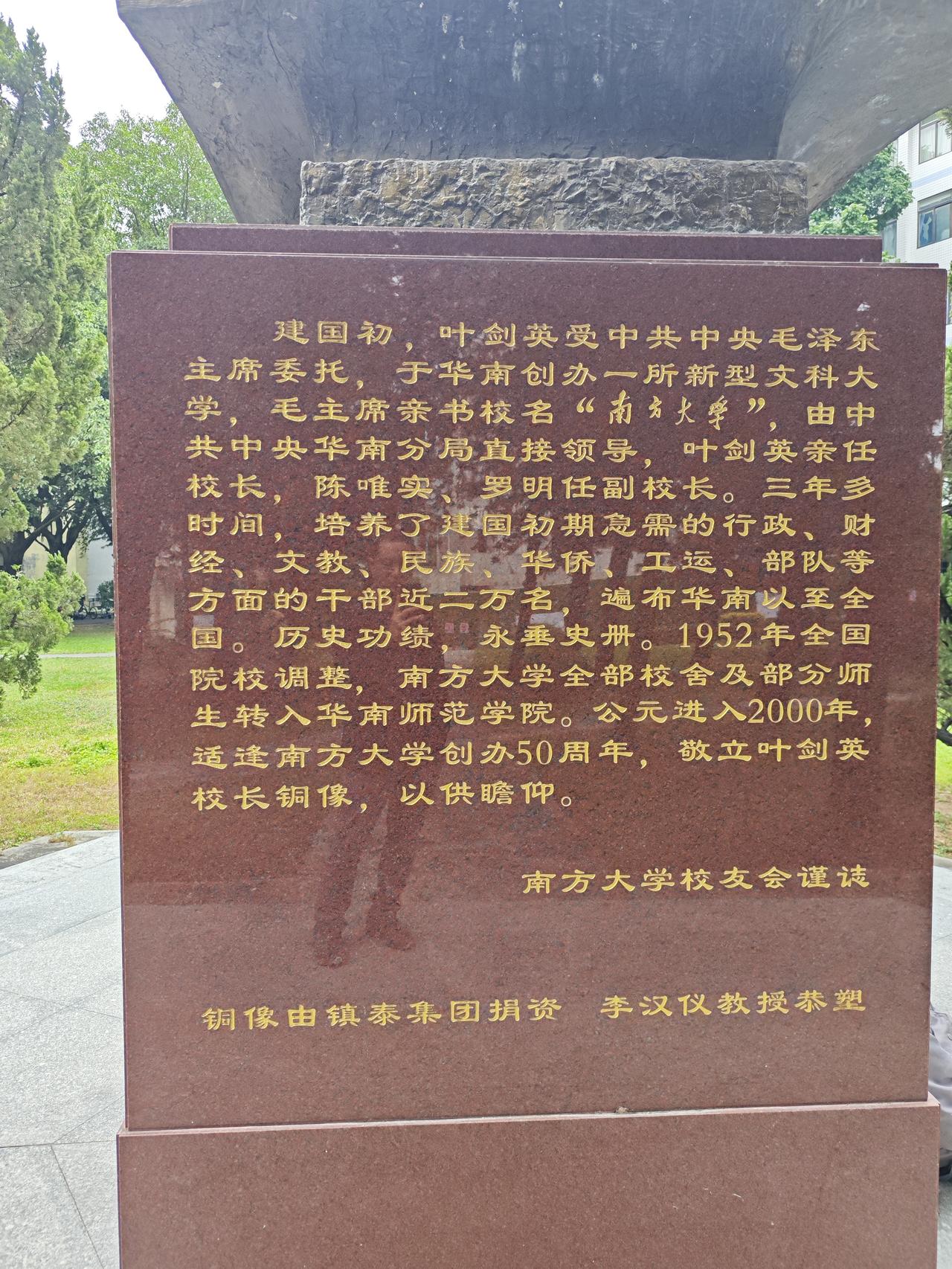 相信很多人都不知道,广州曾经有一所“南方大学”,校址就在现今的华南师范大学。 最近又到华师大异木棉盛开的季节,我来这里凑个热闹。在信息学院大楼旁的草地上,意外看见了叶帅的雕像,不明所以,于是走近一看。雕像前方写着“南方大学”叶剑英校长,基座的后面是关于雕像设立的缘由。由此,也揭开了广州“南方大学”的历史。 南方大学是广州历史上存在时间较短的一所“过渡”性大学,由创办到改制为广东革命干部学院。学校存续了3年时间,时间很短,但为新中国输送了近2万名政工干部队伍。据说当年南方大学最初建立时,校舍大多为草棚,条件十分艰苦。 当年的南方大学,是一所“革命大熔炉”,教学就是一场战斗,跟现在的大学完全不同,没有寒暑假,教学可以说是争分夺秒,没日没夜都在紧张地学习,周日和节假日都在上课,为革命建设争取时间。 1952年8月,学校改制后,原校址由华南师范学院全部继承,教员分别分配到中山大学,广东民族学院(现广东技术示范大学),华南师范学院。 现在,你看见的华师大的正门,和当年南方大学正门的架构基本一致。大学 南方大学 华南师范大学 广州身边事
