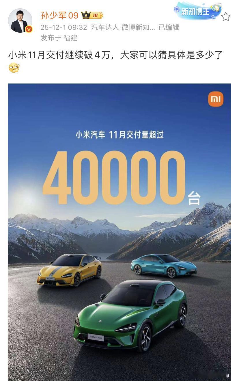孙少军:小米11月交付继续破4万,大家可以猜具体是多少了[狗头] 小米这个产量可以呀,还能稳定在4万辆的水平,小米在12月份能不能突破5万辆的水平来到一个全新的高度呢,咱们拭目以待。 小米目前最需要的就是努力提高产能,另外积极扩展新的订单,再正常的将小米SU7这款车进行换代。