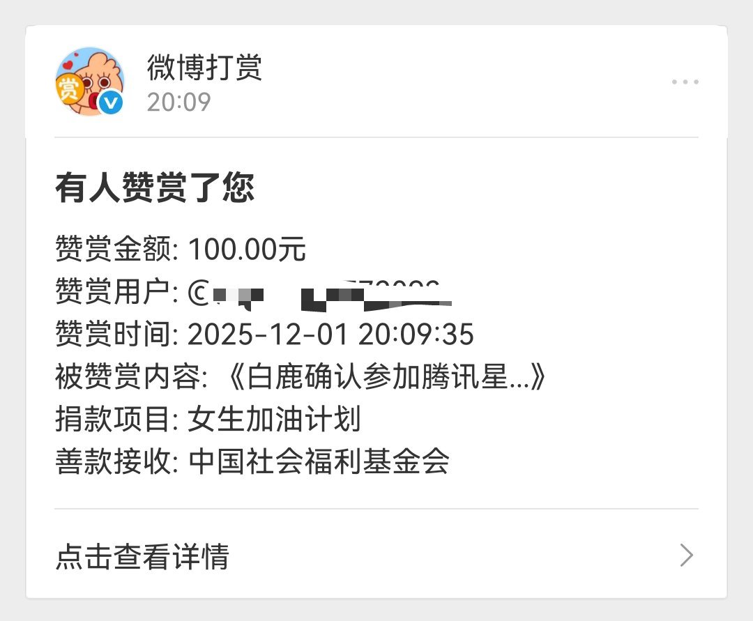 谢谢赞赏,谢谢白鹿粉丝为女生加油计划的捐赠!🙏