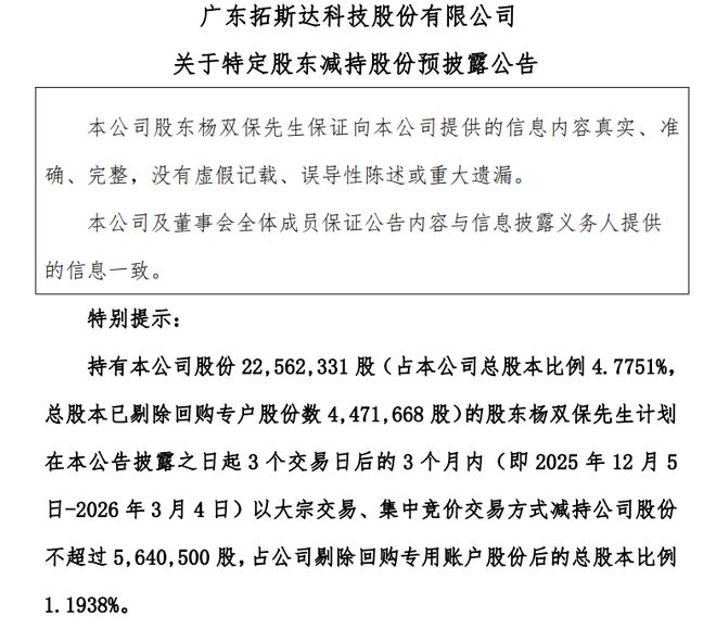 12月1日,拓斯达(300607.SZ)发布公告,股东杨双保先生计划在本公告披露之日起3个交易日后的3个月内(即2025年12月5日-2026年3月4日)以大宗交易、集中竞价交易方式减持公司股份不超过564.05万股,占公司剔除回购专用账户股份后的总股本比例1.1938%。