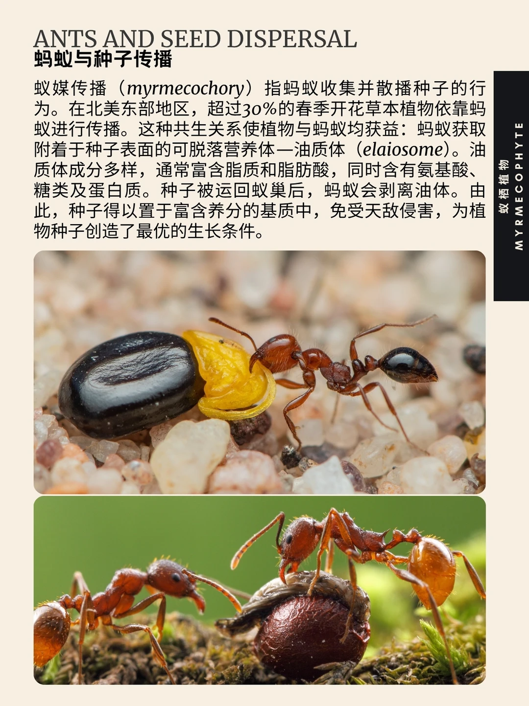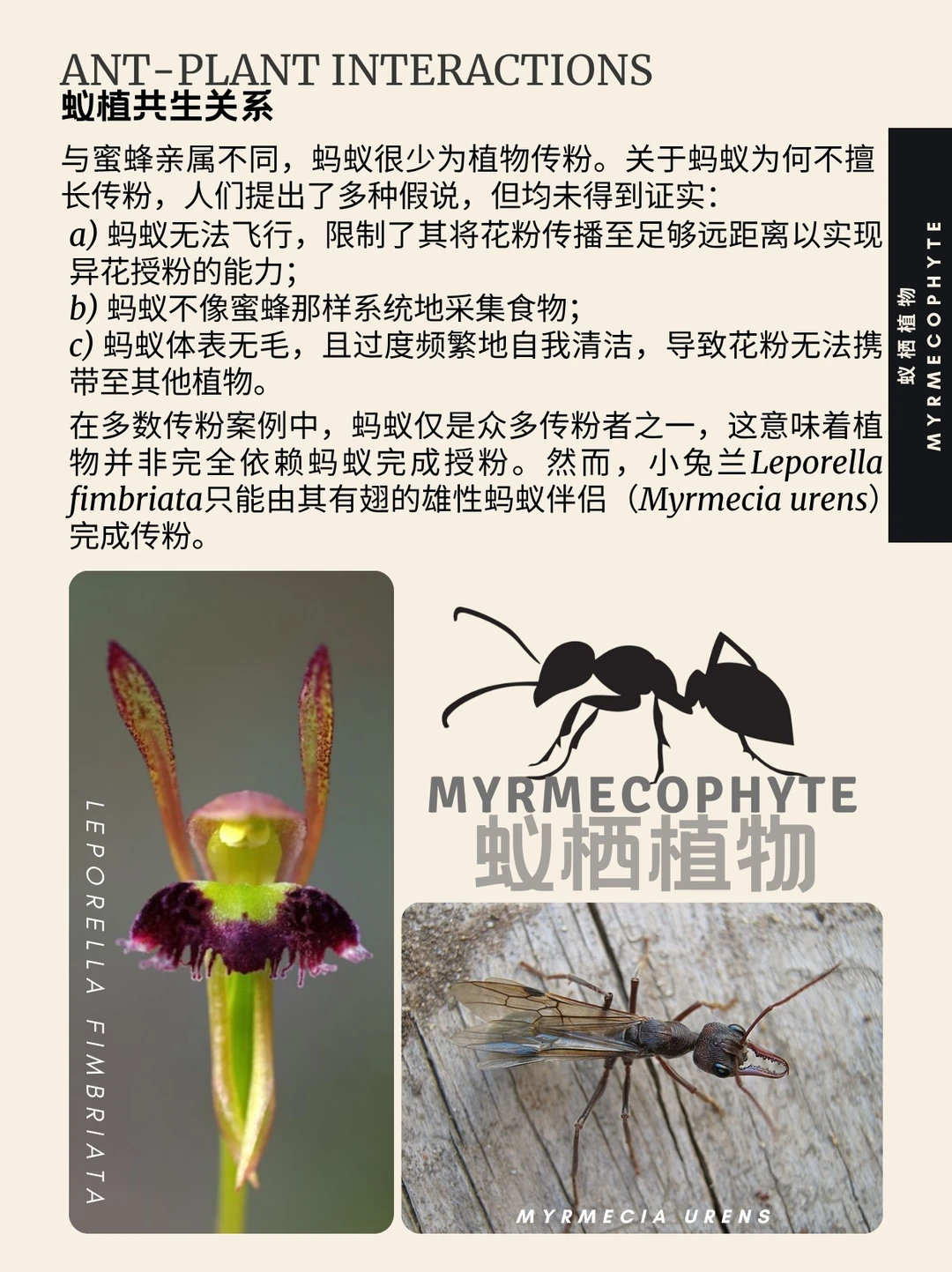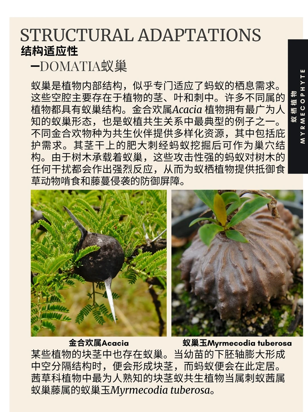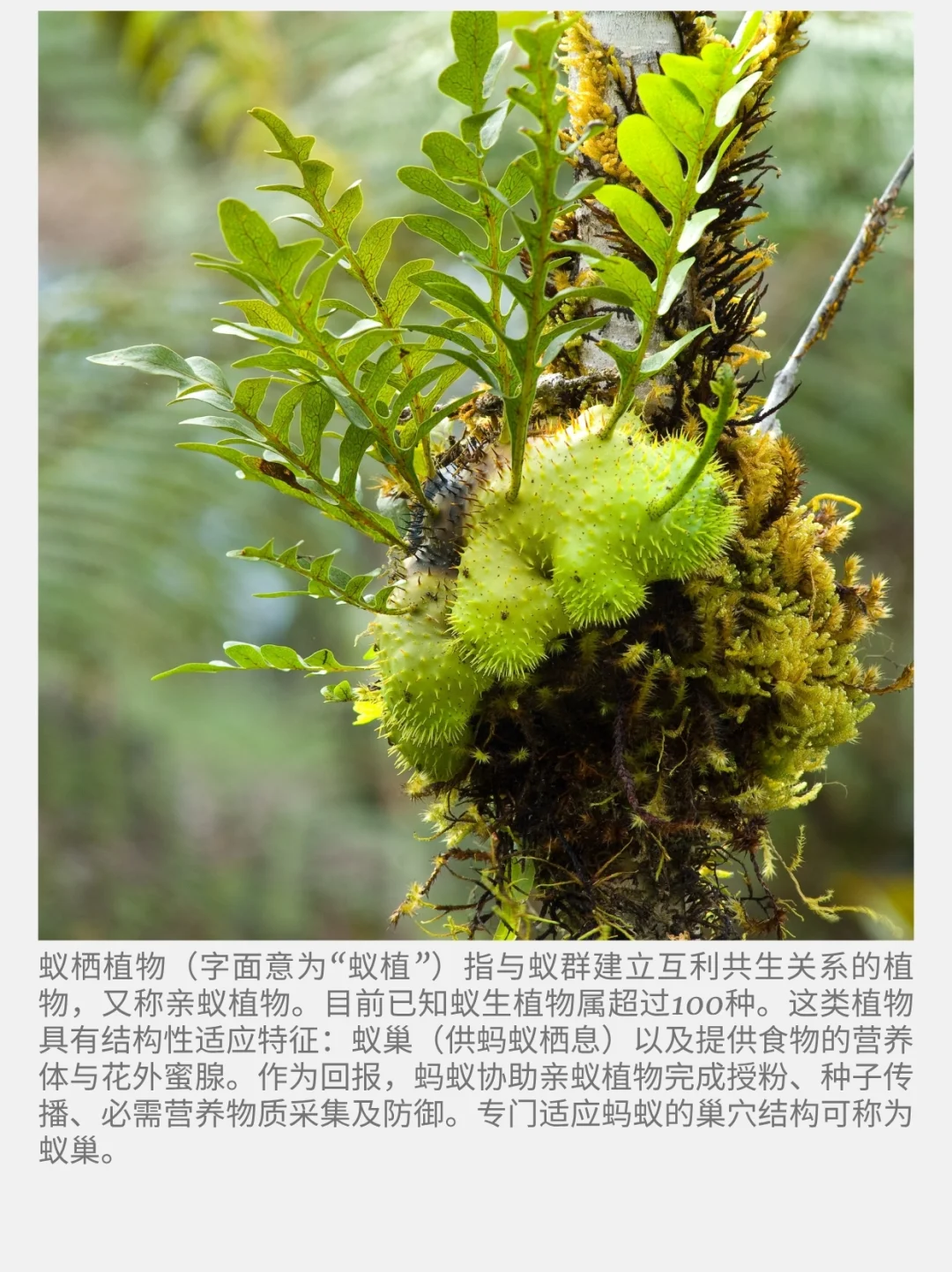 蚁栖植物 蚁植 Myrmecophyte 亲蚁植物 蚁巢 蚂蚁 蚁栖植物(字面意为“蚁植”)指与蚁群建立互利共生关系的植物,又称亲蚁植物。目前已知蚁生植物属超过100种。这类植物具有结构性适应特征:蚁巢(供蚂蚁栖息)以及提供食物的营养体与花外蜜腺。作为回报,蚂蚁协助亲蚁植物完成授粉、种子传播、必需营养物质采集及防御。专门适应蚂蚁的巢穴结构可称为蚁巢。