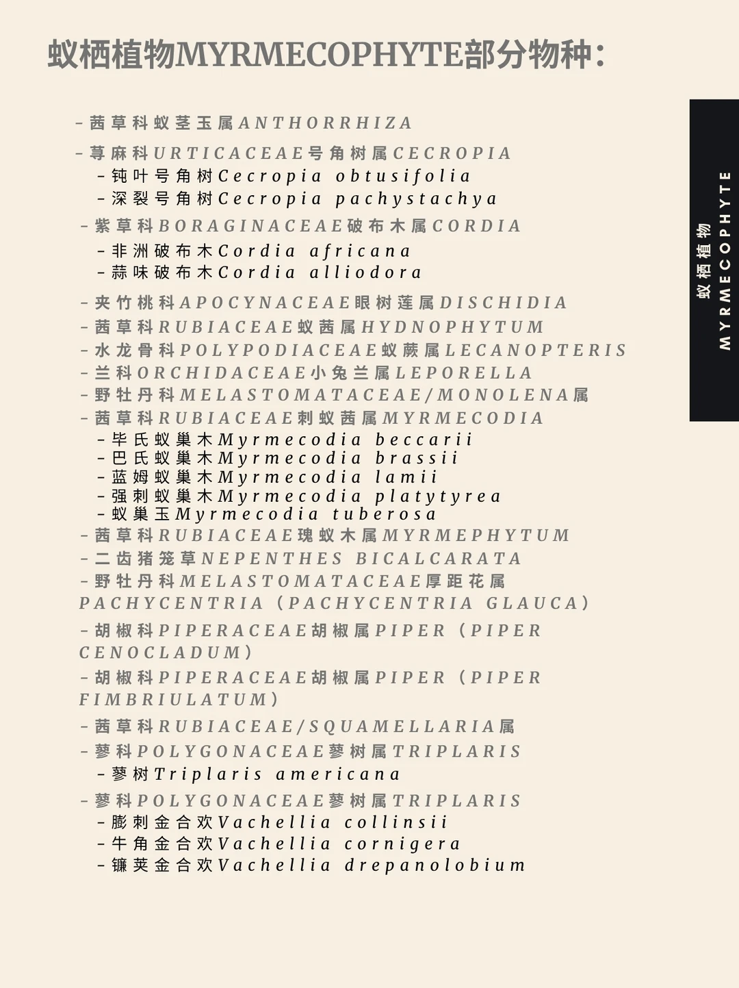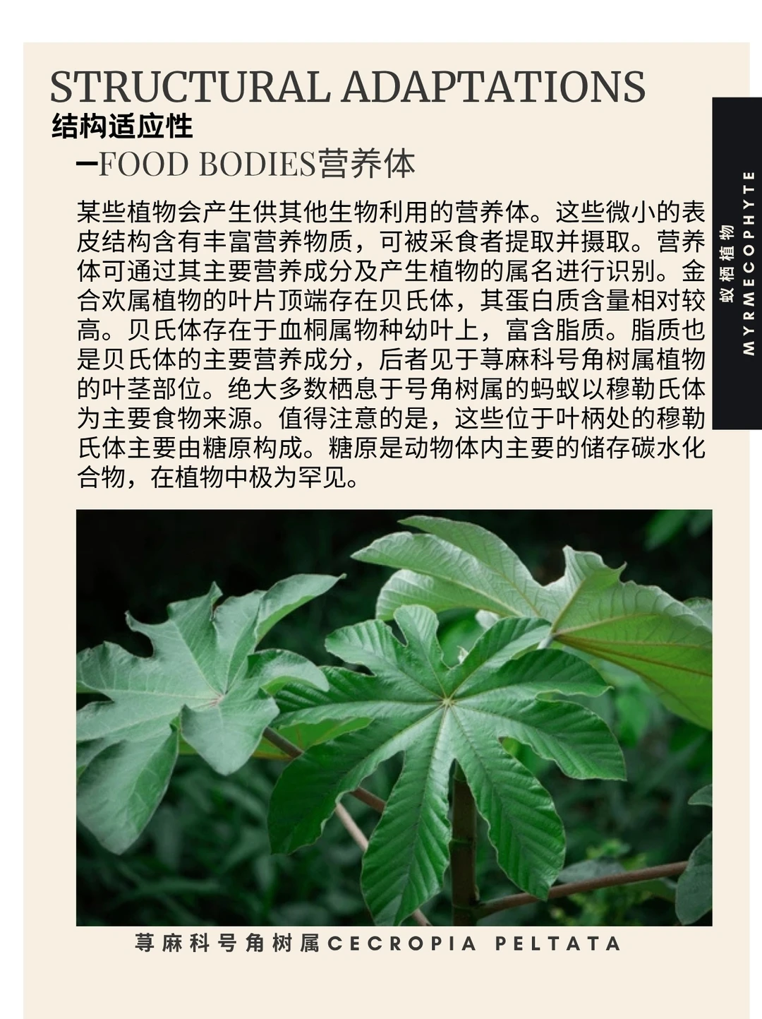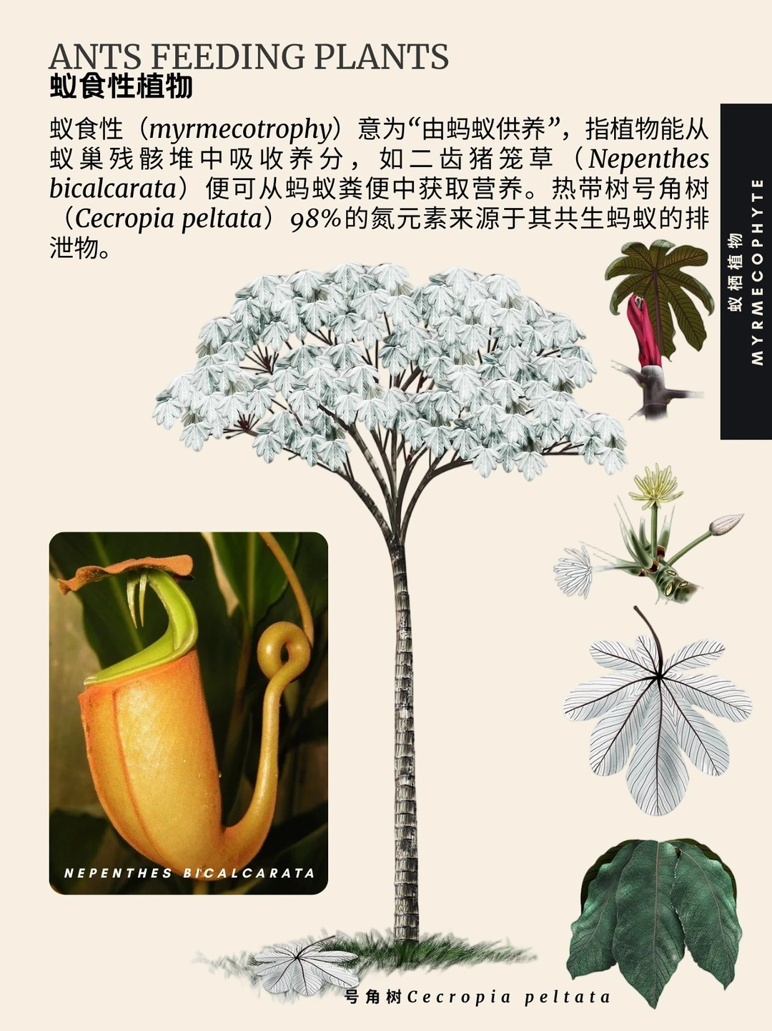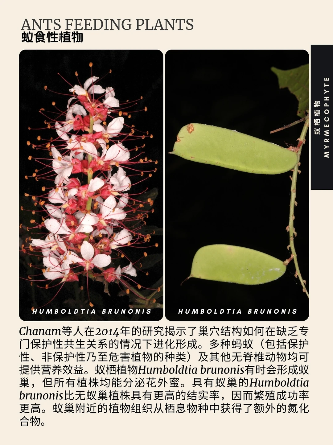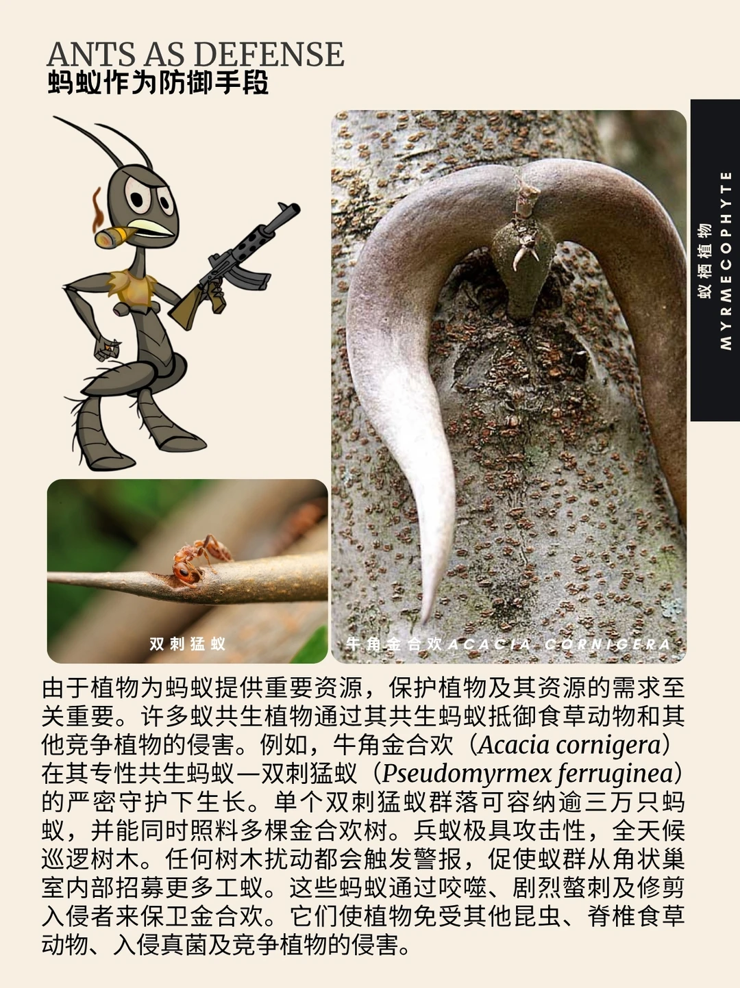 蚁栖植物 蚁植 Myrmecophyte 亲蚁植物 蚁巢 蚂蚁 蚁栖植物(字面意为“蚁植”)指与蚁群建立互利共生关系的植物,又称亲蚁植物。目前已知蚁生植物属超过100种。这类植物具有结构性适应特征:蚁巢(供蚂蚁栖息)以及提供食物的营养体与花外蜜腺。作为回报,蚂蚁协助亲蚁植物完成授粉、种子传播、必需营养物质采集及防御。专门适应蚂蚁的巢穴结构可称为蚁巢。