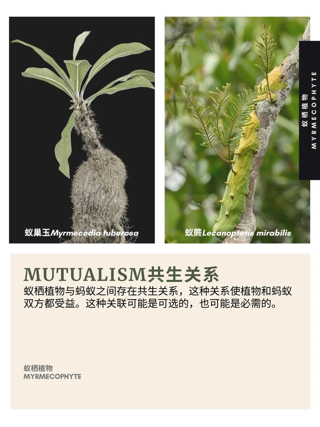 蚁栖植物与蚂蚁之间存在共生关系,这种关系使植物和蚂蚁双方都受益。这种关联可能是可选的,也可能是必需的。