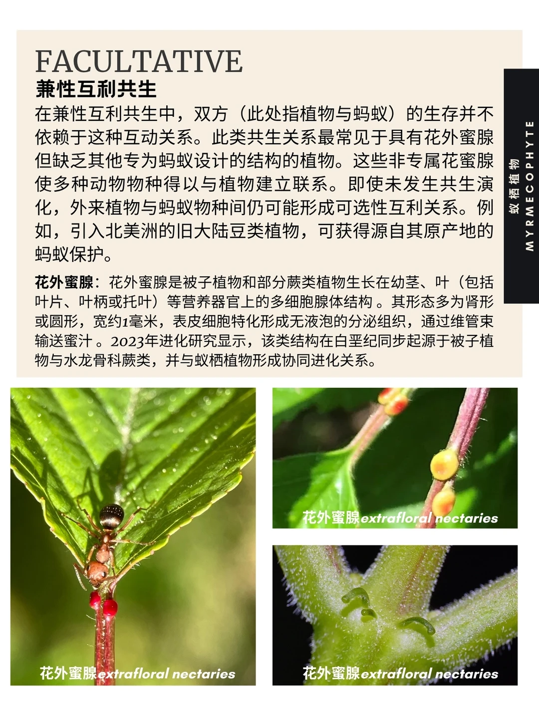 在兼性互利共生中,双方(此处指植物与蚂蚁)的生存并不依赖于这种互动关系。此类共生关系最常见于具有花外蜜腺但缺乏其他专为蚂蚁设计的结构的植物。这些非专属花蜜腺使多种动物物种得以与植物建立联系。即使未发生共生演化,外来植物与蚂蚁物种间仍可能形成可选性互利关系。例如,引入北美洲的旧大陆豆类植物,可获得源自其原产地的蚂蚁保护。