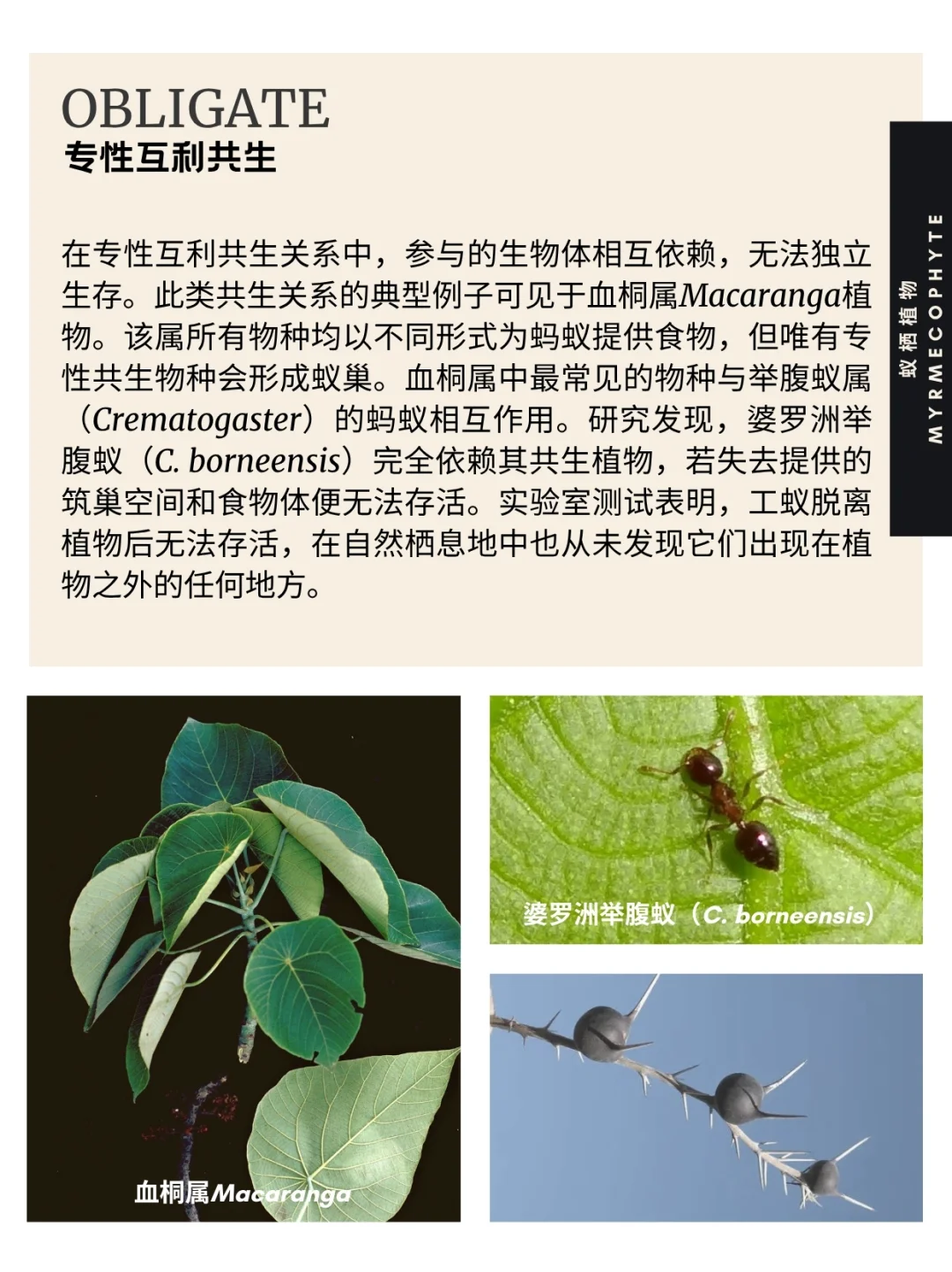 在专性互利共生关系中,参与的生物体相互依赖,无法独立生存。此类共生关系的典型例子可见于血桐属Macaranga植物。该属所有物种均以不同形式为蚂蚁提供食物,但唯有专性共生物种会形成蚁巢。血桐属中最常见的物种与举腹蚁属(Crematogaster)的蚂蚁相互作用。研究发现,婆罗洲举腹蚁(C. borneensis)完全依赖其共生植物,若失去提供的筑巢空间和食物体便无法存活。实验室测试表明,工蚁脱离植物后无法存活,在自然栖息地中也从未发现它们出现在植物之外的任何地方。