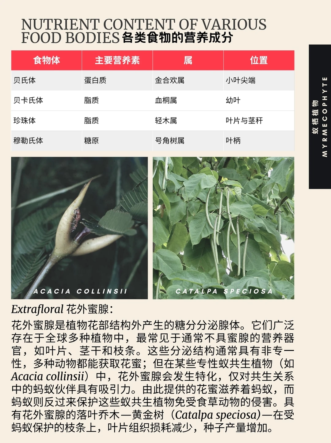 花外蜜腺:花外蜜腺是被子植物和部分蕨类植物生长在幼茎、叶(包括叶片、叶柄或托叶)等营养器官上的多细胞腺体结构 。其形态多为肾形或圆形,宽约1毫米,表皮细胞特化形成无液泡的分泌组织,通过维管束输送蜜汁 。2023年进化研究显示,该类结构在白垩纪同步起源于被子植物与水龙骨科蕨类,并与蚁栖植物形成协同进化关系。