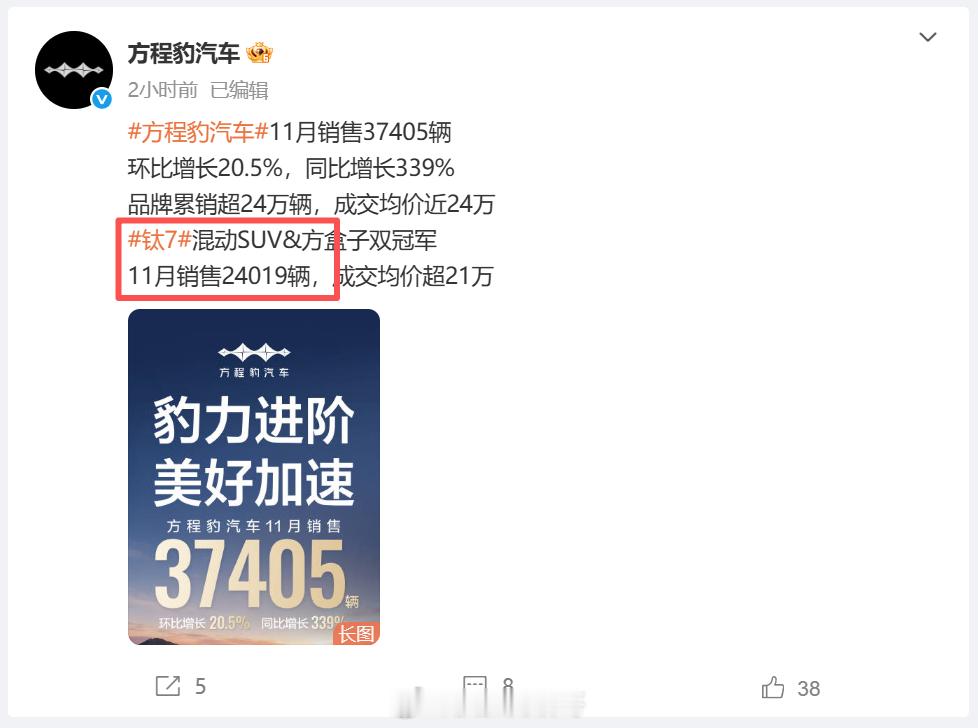 方程豹这波数据,可以说是豹力全开了! 月销冲上3.7万+,增速还很猛,现在的主销车型钛7表现十足的强势,这新车可直接占品牌总销量约64%了啊,绝对的销量担当,目前我最看好的一个品牌,而且不是低价车,说明市场对这类差异化产品的接受度很高。大v聊车
