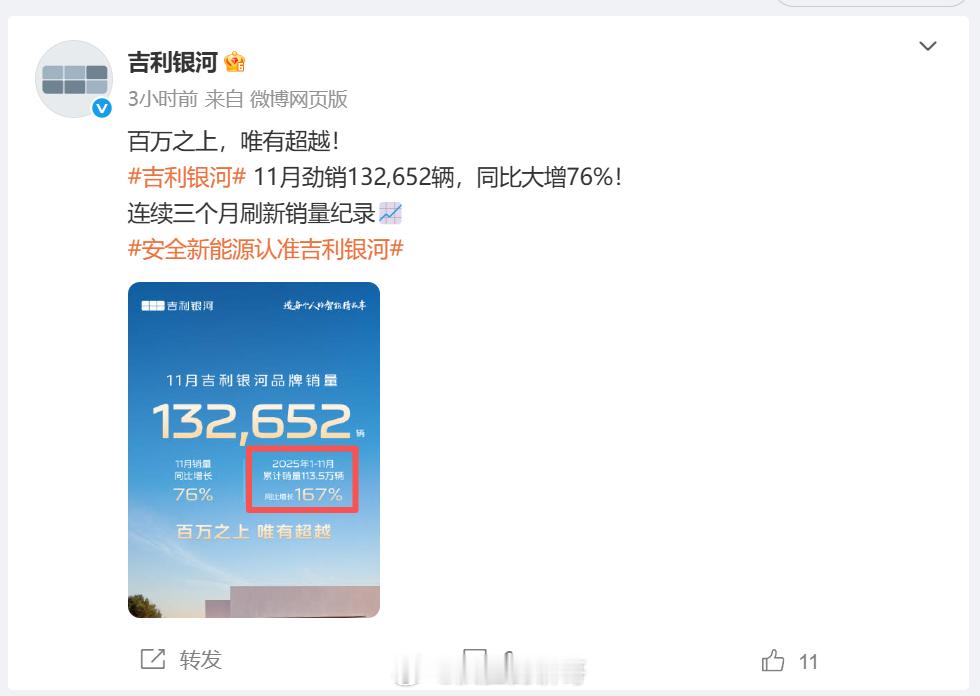 吉利银河虽然很年轻,但是已经快速成长为一个国民级新能源品牌。作为银河车主我认为在10–20万级新能源市场,银河的车型面向主流家庭用户,外观内饰设计在线,然后是销量大、增长快、定位准, 最可怕的是今年的1–11月累计已破113.5万辆,恐怖的同比增长167%!大v聊车