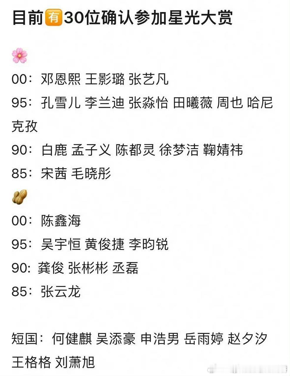 星光大赏 确认参加星光大赏的艺人:00:邓恩熙 王影璐 张艺凡95:孔雪儿 李兰迪 张淼怡 田曦薇 周也 哈尼克孜90:白鹿 孟子义 陈都灵 徐梦洁 鞠婧祎85:宋茜 毛晓彤00:陈鑫海95:吴宇恒 黄俊捷 李昀锐90:龚俊 张彬彬 丞磊85:张云龙短国:何健麒 吴添豪 申浩男 岳雨婷 赵夕汐 王格格 刘萧旭