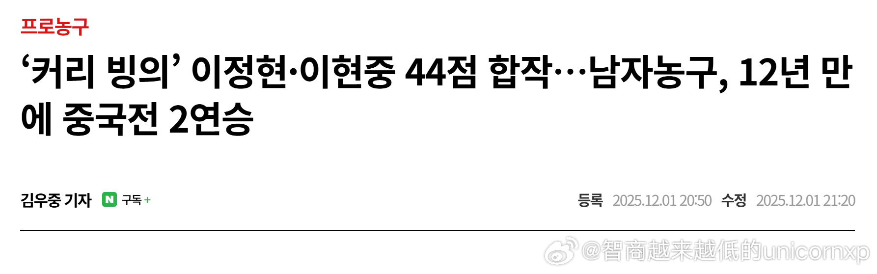韩国各大媒体的新闻标题出奇一致:李政炫和李贤重联手砍下44分,韩国男篮再越“万里长城”,时隔12年拿下两连胜中国男篮vs韩国男篮