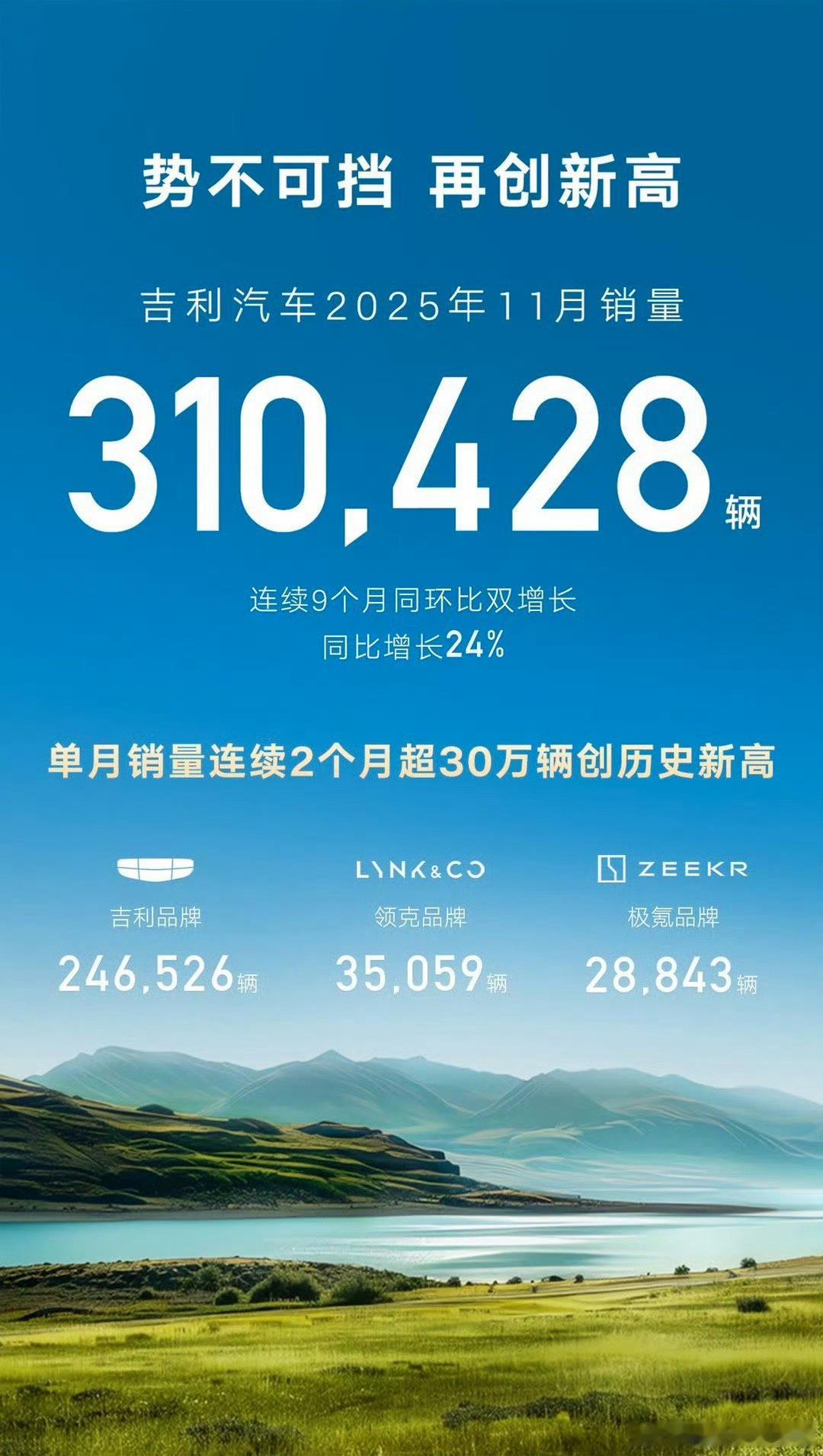 吉利11月卖了超过31万辆,连续9个月都是双增长,其中:- 吉利银河 132652 辆,累计已经113.5万台了- 极氪 28843 辆;- 领克 35059 辆。跟大家简单聊聊。从多线布局上看,吉利这一年来虽然大力发展插混和纯电路线,但是燃油路线也没有放弃,前段时间帝豪、星越等车型的热度也很高,“中国星”系列月销超11万辆,在中国,提到燃油车绝对离不开吉利。插混和纯电,最大的黑马无疑是“吉利银河”,11月单月销量超13万辆,凭借着大量的亲民车型和智能化铺设快速上量,每一细分领域都有破万月销的大热门。极氪、领克两个品牌合并到一个集团之后,资源共用的优势释放得很快,两个品牌都加入了插混和纯电产品,共同推动集团车型均价提升,品牌力、盈利能力都在逐步拔高。现在我更关注吉利明年的布局:银河完成了主流家用市场的布局后,也开始思考品牌更大的潜力,广州车展亮相的V900就是一个预告;极氪和领克所在的位置市场竞品也在虎视眈眈,后面也要打出更加明显的差异化。完。吉利汽车吉利银河大v聊车