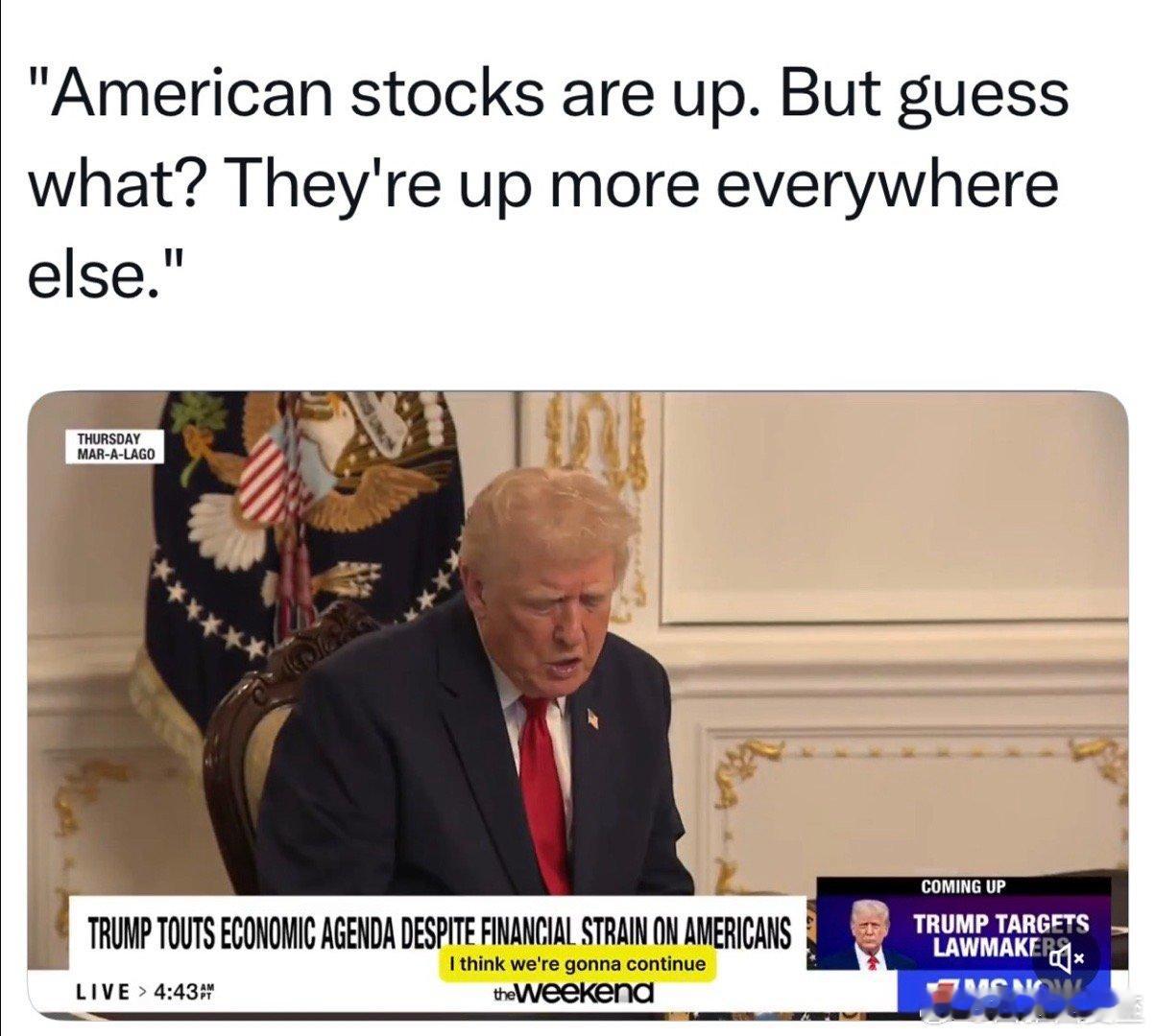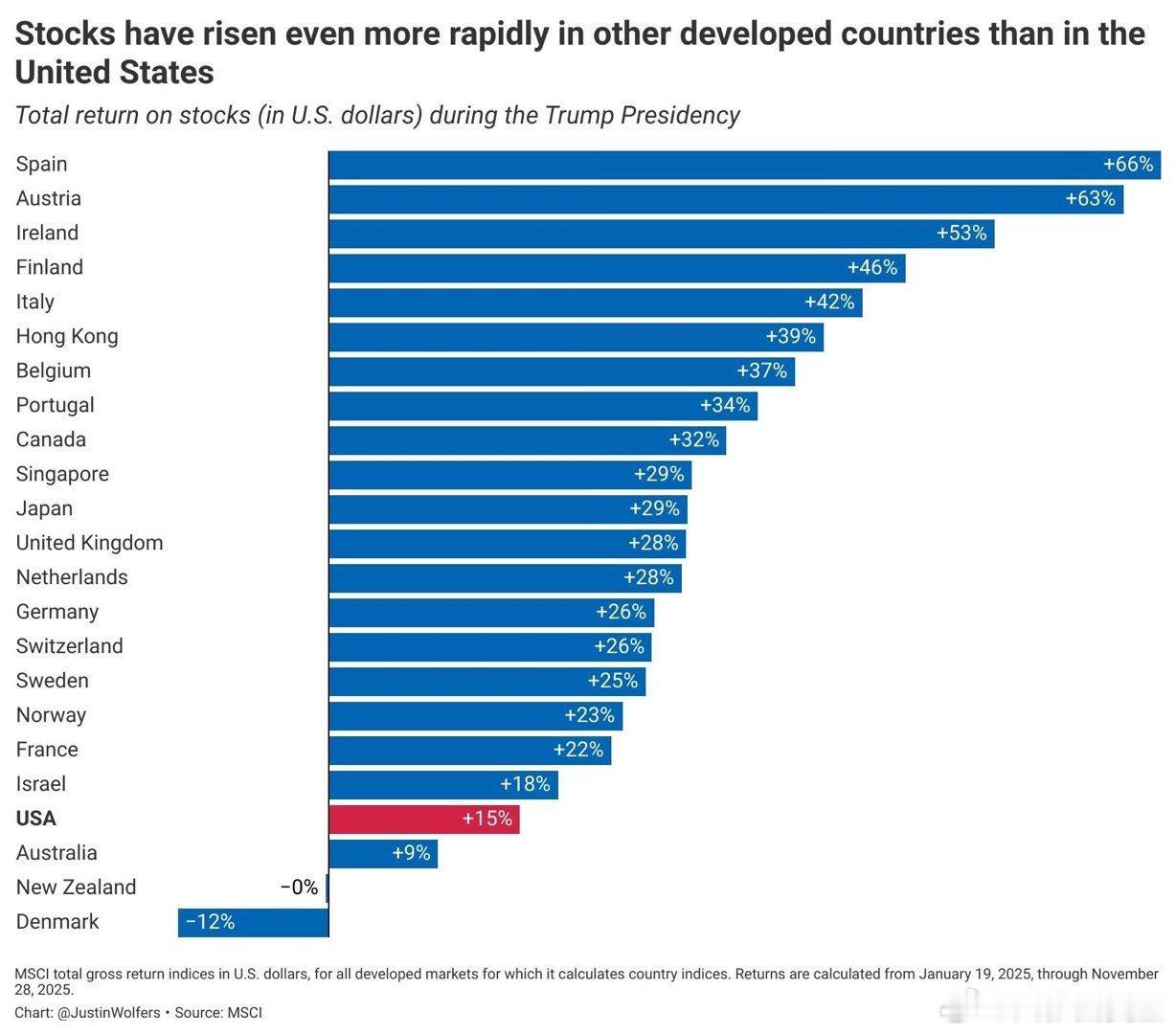 总统感恩节讲话中提到“美股大涨”密歇根大学经济教授:美股涨幅,T就职以来,在发达国家和地区中,排第二十位重要原因,是美元贬值,以美元计的欧洲股市,相对收益更高