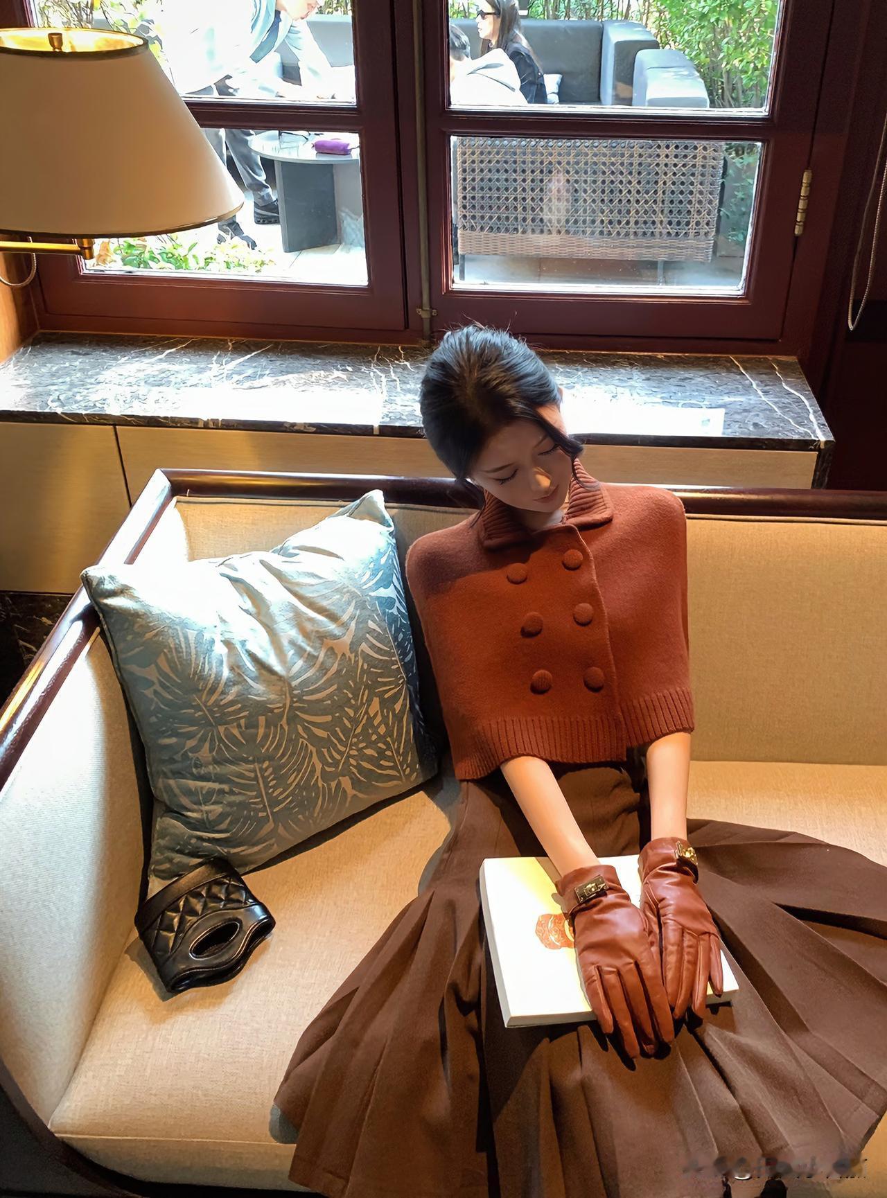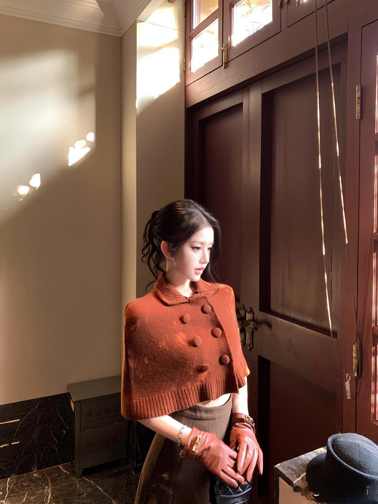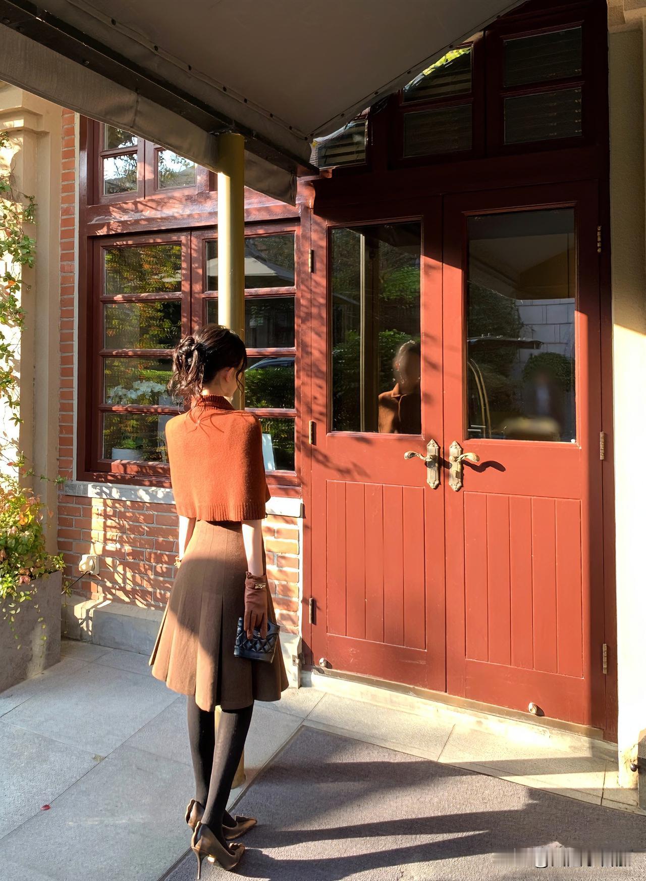 『秋日氛围感穿搭|复古针织斗篷里的法式慵懒』 焦糖色针织斗篷与百褶裙的碰撞,是秋日写给复古美学的一封情书。 翻领剪裁利落,双排扣点缀精致,搭配同色系手套,将法式慵懒藏进每寸肌理。 阳光透过红木门棂,落在微扬的裙摆上,仿佛时光都愿为这份温柔驻足。谁说秋冬只能沉闷?用一组焦糖色系搭配,做街头最馥郁的复古画报女孩。 秋冬暖系穿搭分享 焦糖色连衣裙怎么搭配出高级感