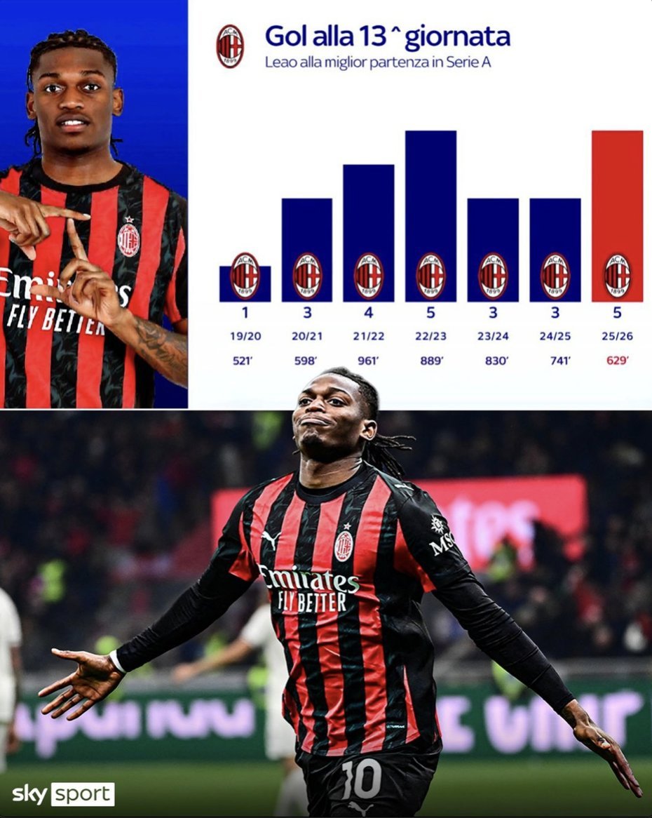 【Sky】 🔴⚫️ 拉斐尔·莱奥🇵🇹在本赛季迄今为止的13场意甲联赛 中打进5球(与2022-23赛季相等),但此次平均每629分钟就打进一球。sempremilan