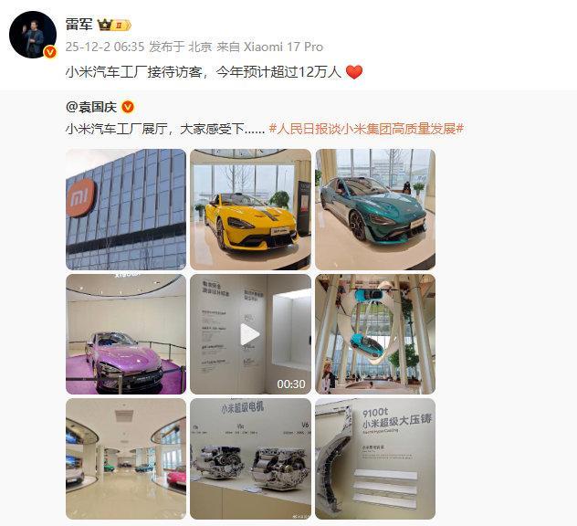 【今年小米汽车工厂访客预计超12万人雷军透露小米汽车工厂接待访客人数】小米创办人,董事长兼CEO发文称:小米汽车工厂接待访客,今年预计超过12万人