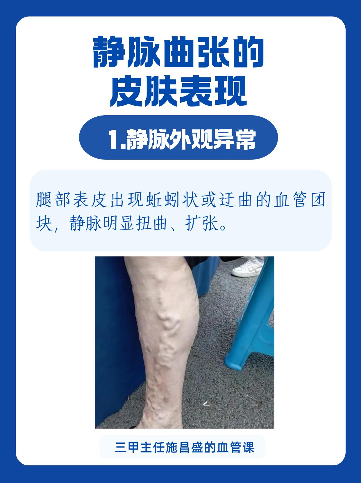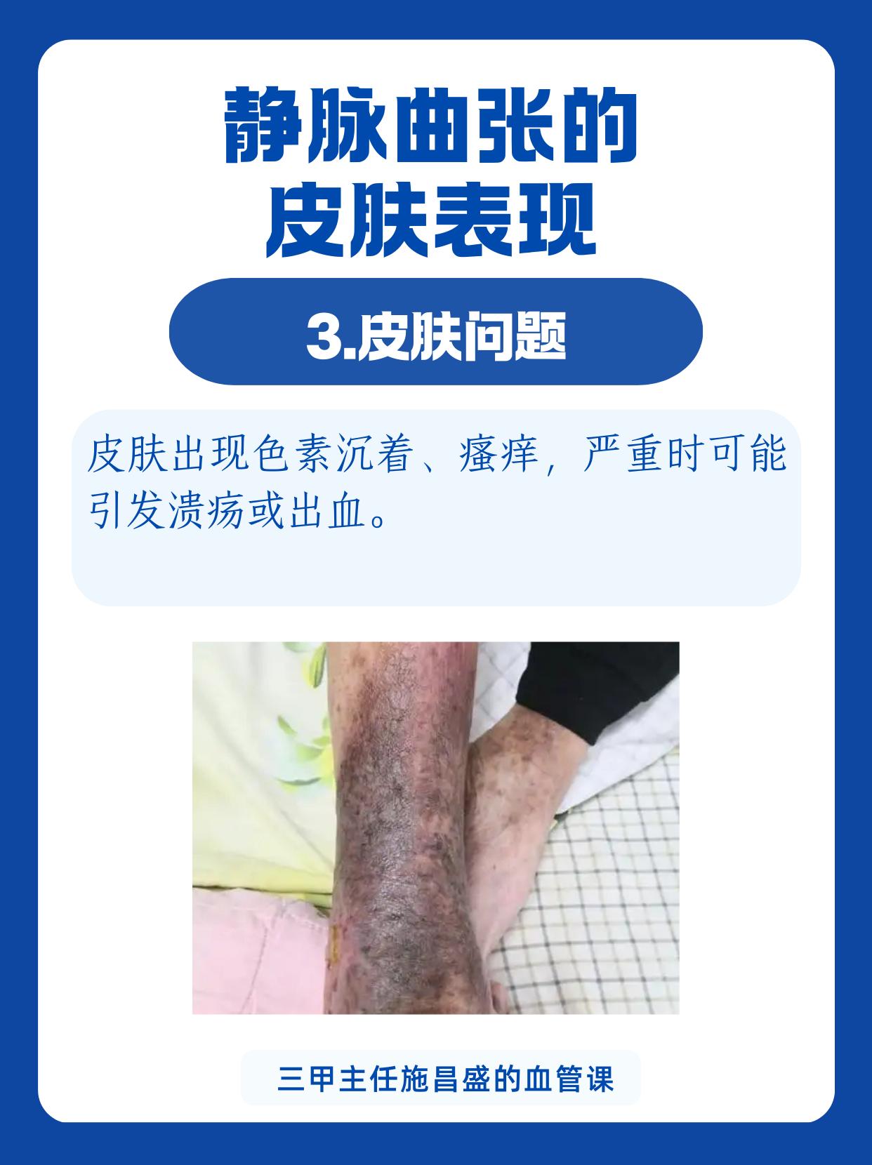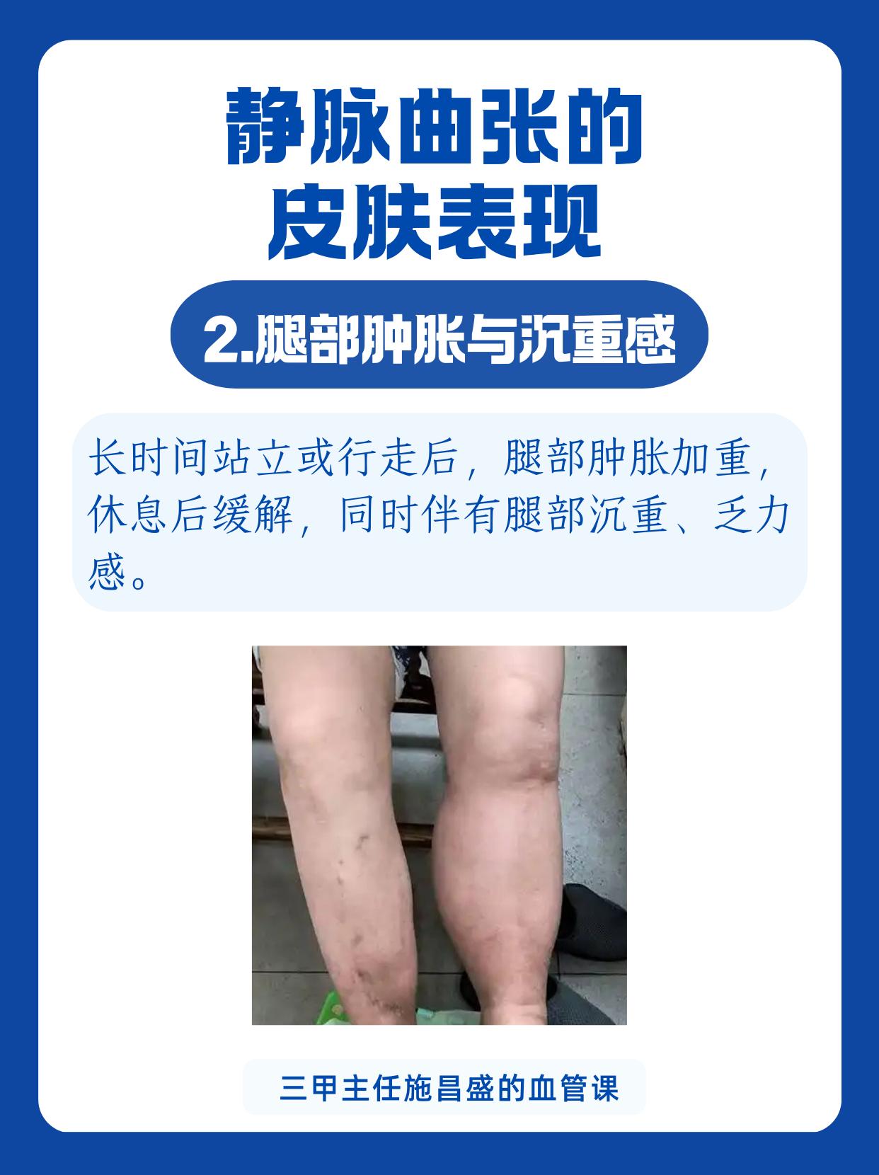 静脉曲张的皮肤表现。腿部现蚯蚓状血管团,静脉扭曲扩张,久站久行腿更肿,休息缓解却沉重乏力。更糟的是,皮肤色素沉着、瘙痒难耐,溃疡出血风险高,出现这些症状,需及时就医诊治!