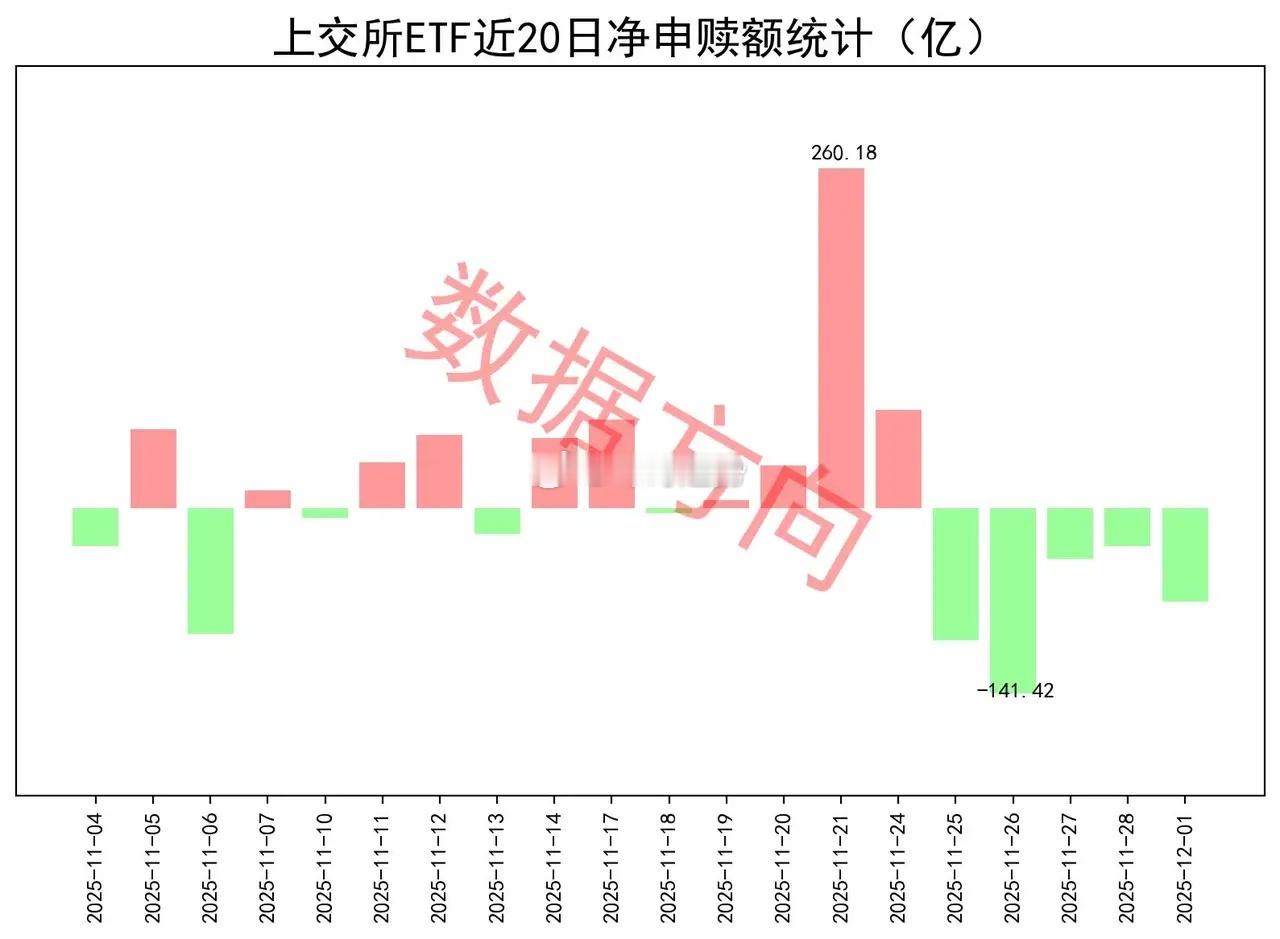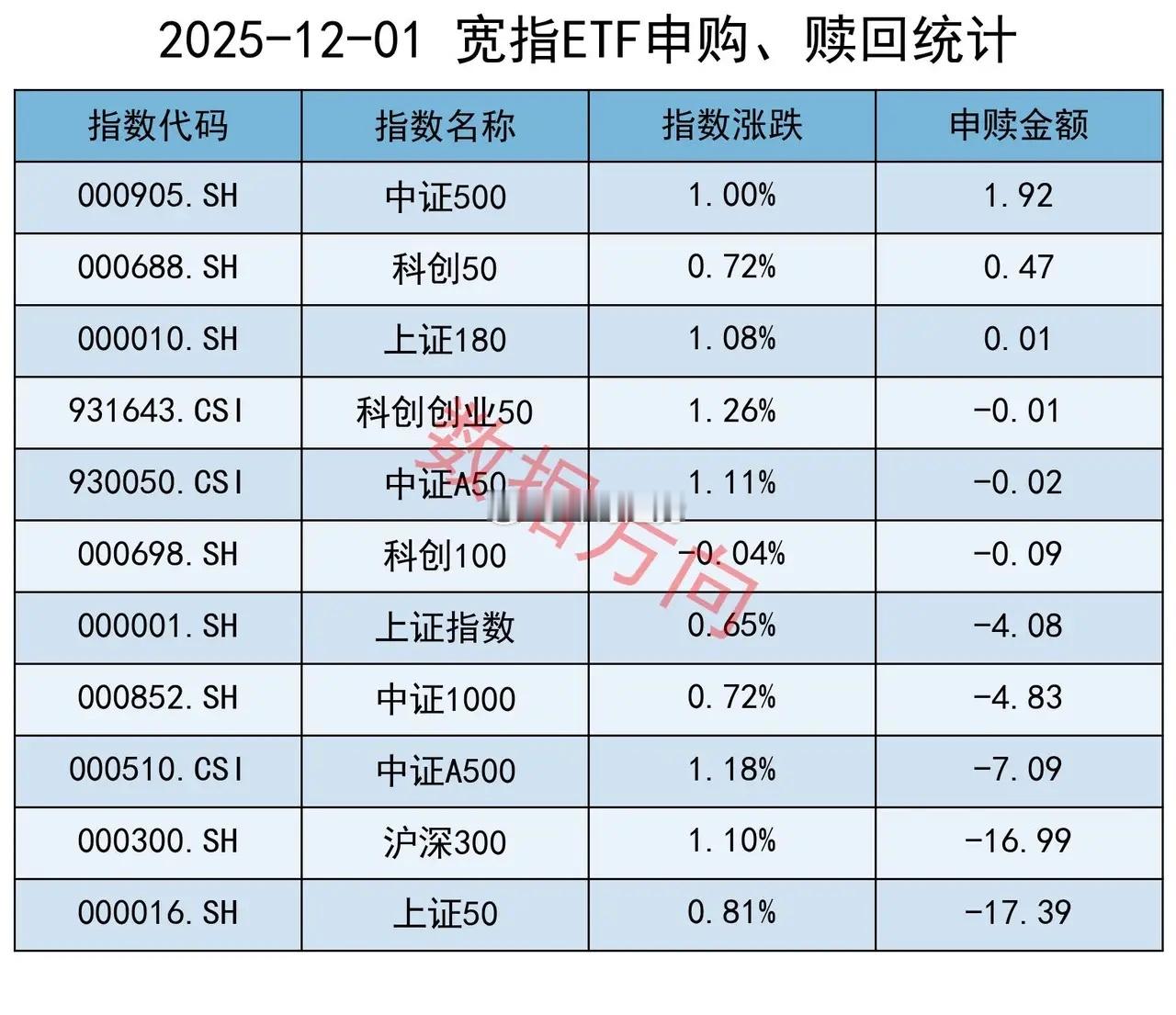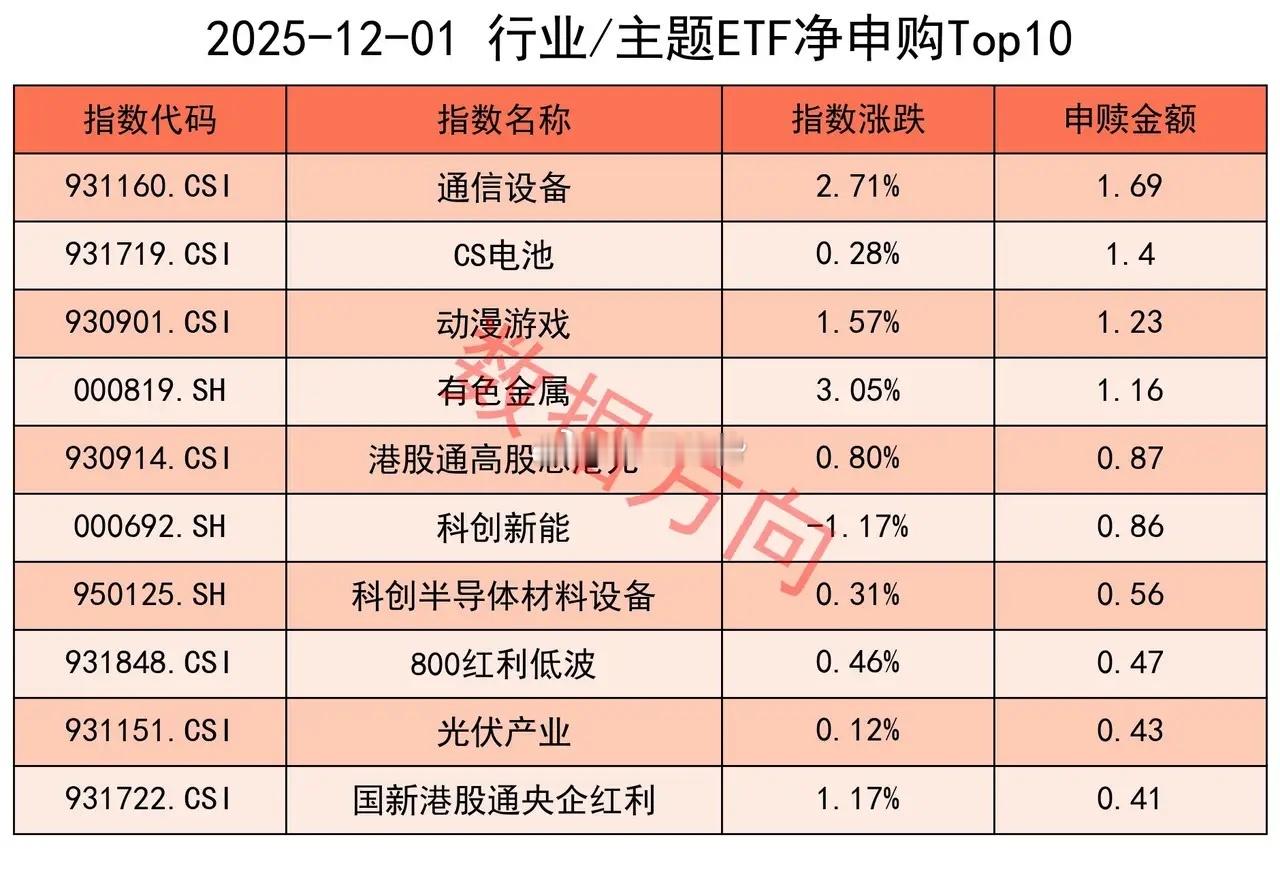 上交所ETF连续5天净赎回12月1日星期一,大盘放量上涨收获开门红,有色金属、智能手机涨幅居前。上证指数涨幅0.65%,上交所ETF合计净赎回71.02亿元。这是连续第5天净赎回。宽指中证500指数(1.92亿)、科创50指数(0.47亿)、上证180指数(0.01亿),分别获小幅净申购。上证50指数(-17.39亿)、沪深300指数(-16.99亿),双双净赎回超过15亿。中证A500指数(-7.09亿),净赎回超5亿。中证1000指数(-4.83亿)、上证指数(-4.08亿)、科创100指数(-0.09亿)、中证A50指数(-0.02亿)、科创创业50指数(-0.01亿),分别被小幅净赎回。行业和主题 CS电池指数(1.4亿)、科创新能指数(0.86亿)、光伏产业指数(0.43亿),一起进入申购榜。港股通高股息港元指数(0.87亿)、800红利低波指数(0.47亿)、国新港股通央企红利指数(0.41亿),一起进入申购榜。其他进入申购榜的还有:通信设备指数(1.69亿)、动漫游戏指数(1.23亿)、有色金属指数(1.16亿)、科创半导体材料设备指数(0.56亿)。中证银行指数(-4.49亿)、证券公司指数(-4.11亿)、300非银指数(-1.09亿),一起进入赎回榜。军工龙头指数(-1.64亿)、中证军工指数(-1.62亿)、卫星产业指数(-1.3亿),一起进入赎回榜。其他进入赎回榜的还有:半导体指数(-2.56亿)、红利低波指数(-1.99亿)、SSH黄金股票指数(-1.73亿)、机器人指数(-1.5亿)。ETF财经今日看盘马市长 邓超