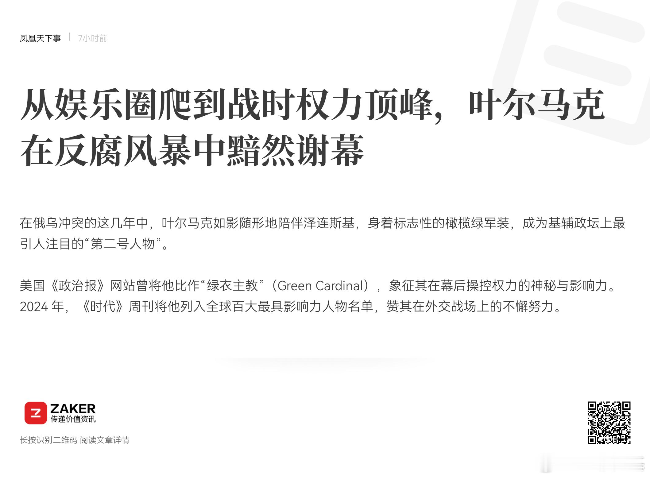 📌乌克兰🚫从娱乐圈爬到战时权力顶峰,叶尔马克在反腐风暴中黯然谢幕个人高光时刻2022 年 2 月 24 日俄乌冲突爆发,《时代》周刊描述道:"在总统府的地下室,叶尔马克像不眠的协调员,处理从武器援助到媒体宣传的一切。"泽连斯基称赞他为"爱国主义化身",两人常身着匹配的绿军装现身,象征团结。叶尔马克协调总统办公室,发起"泽连斯基和平公式"——要求俄罗斯完全撤军、赔偿损失并接受审判。2023 年,他与迈克尔 · 麦克福尔共同发起"叶尔马克 - 麦克福尔制裁小组",推动全球对俄经济封锁;与安德斯 · 福格 · 拉斯穆森组建"乌克兰 - 北约小组",争取安全保障;主导"乌克兰谷物"计划,出口 2500 万吨粮食,缓解全球饥荒。2023 年 12 月,叶尔马克访美,推动拜登政府追加 610 亿美元援助。《华盛顿邮报》2024 年 5 月称:"战时条件下,叶尔马克重塑了总统办公室的权力,堪称史上最强首席幕僚。"在腐败风暴中黯然谢幕这些成就并非无懈可击,《政治报》指出,叶尔马克的管理虽高效,却疏离现实,2025 年腐败调查中,他涉嫌干预能源回扣案,虽未被指控,但其兄弟丹尼斯的录音曝光加剧质疑。《乌克兰真理报》爆料称,"当泽连斯基要求叶尔马克提交辞呈时,后者爆发了长达半小时的歇斯底里,充斥辱骂、指责和控诉。"知情人士透露,叶尔马克难以置信:"他不相信泽连斯基会这样抛弃他。"叶尔马克的生涯,如一出从喜剧到悲剧的独幕剧。从基辅律师到战时"绿衣主教",他见证了乌克兰的抗争与分裂,却倒在了反腐风暴下。在 2025 年的冬日,乌克兰的权力舞台,正迎来新一轮洗牌。从娱乐圈爬到战时权力顶峰,叶尔马克在反腐风暴中黯然谢幕 从娱乐圈爬到战时权力顶峰,叶尔马克在反腐风暴中黯然谢幕