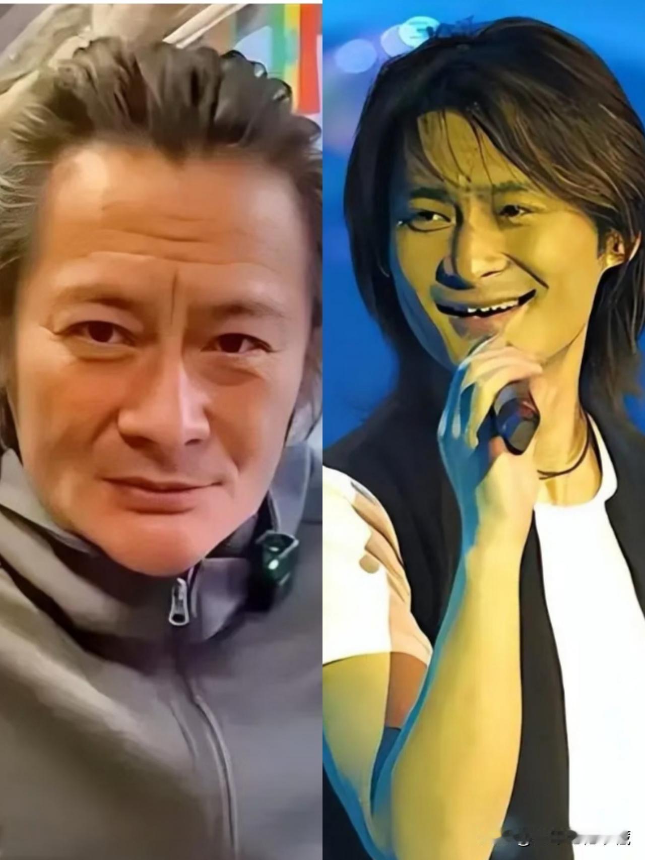 同样都是长发飘飘的景岗山,现在的景岗山面容苍老,蛇精脸,满脸褶子,容貌大变!而以前的景岗山多帅气,五官端正硬朗,身材挺拔有型,极是性感硬汉又是阳光帅气大男孩,这反差太大了,都是喝酒惹的祸!