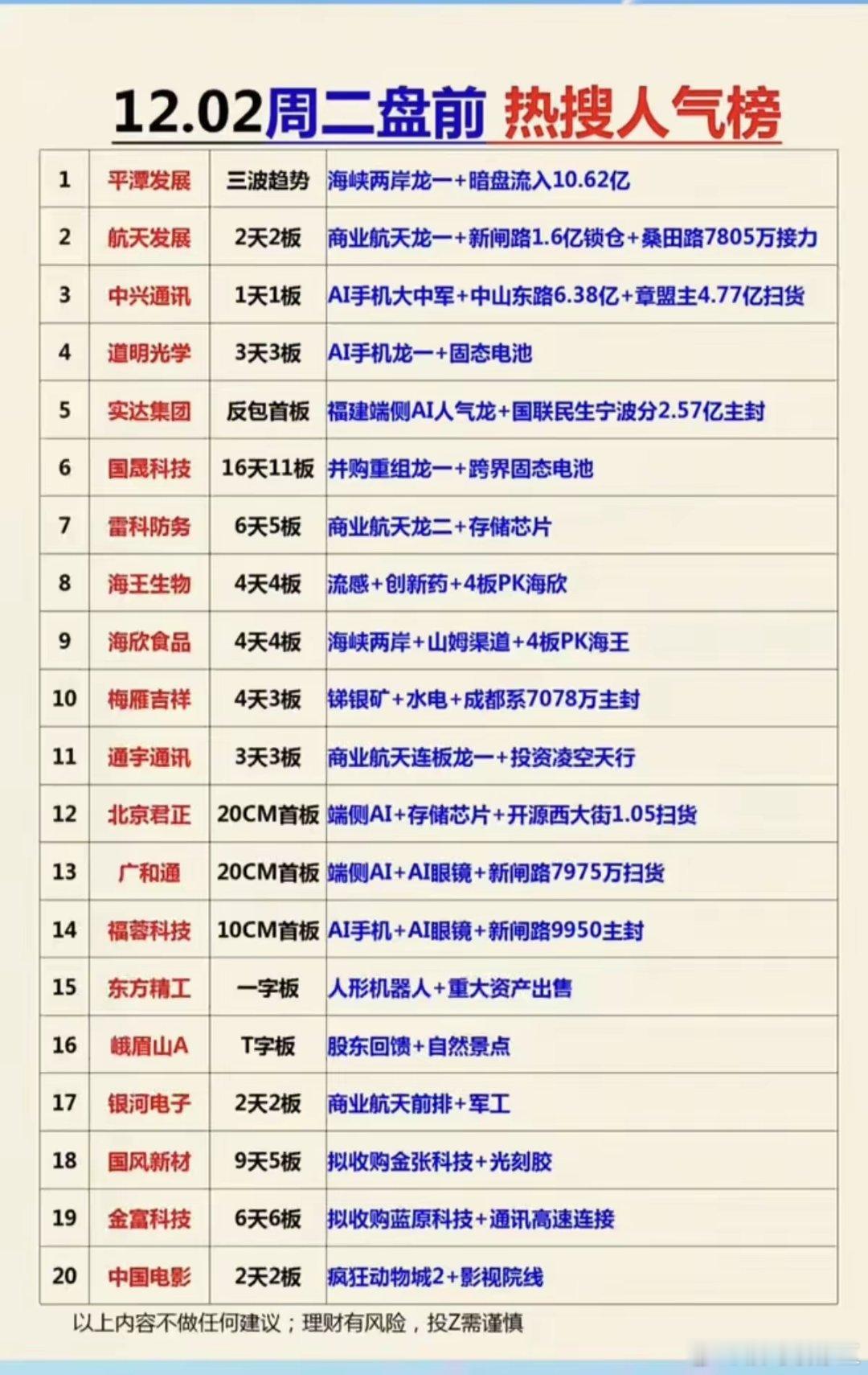 12.02周二盘前 成交活跃个股 热搜榜!龙虎榜个股,人气热榜1.平潭发展:海峡两岸龙一 暗盘10.62亿2.航天发展:2天2板 商业航天 龙虎榜3.中兴通讯:1天1板 AI手机+顶级游资4.道明光学:3天3板 AI手机龙一固态电池5.实达集团:反包首板 福建端侧AI人气龙6.国晟科技:16天11板 并购+固态电池7.雷科防务:6天5板 商业航天+存储芯片8.海王生物:4天4板 流感+创新药9.海欣食品:4天4板 海峡两岸+山姆渠道10.梅雁吉祥:4天3板 锑银矿+水电