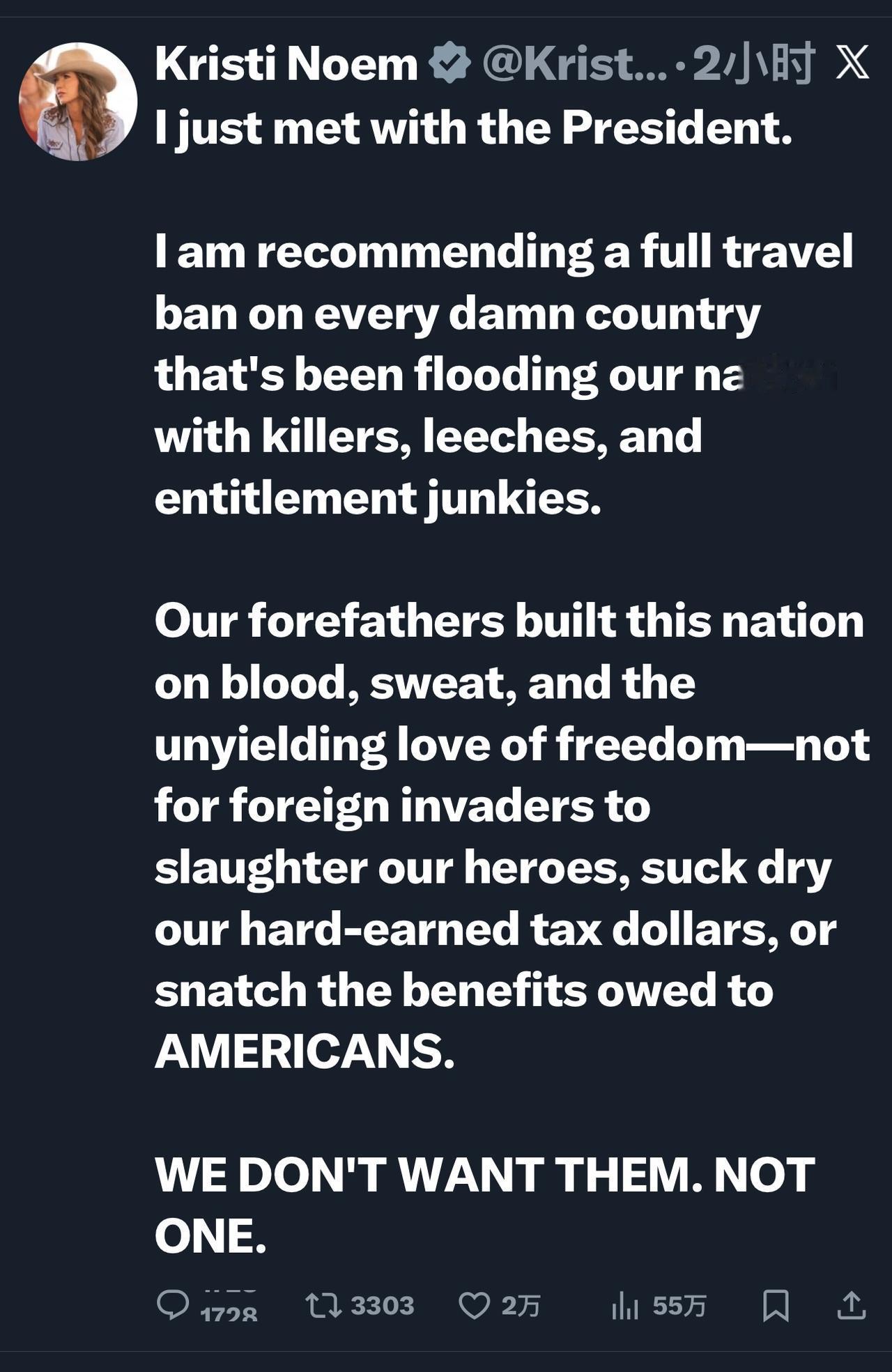 美国国土安全部部长诺姆建议对某些国家实行全面旅行禁令: “我刚刚会见了总统。 我建议对所有向我国输送杀人犯、寄生虫和贪婪之徒的国家实施全面旅行禁令。 我们的先辈们用鲜血、汗水和对自由的坚定热爱建立了这个国家——而不是让外国侵略者屠杀我们的英雄,榨干我们辛辛苦苦挣来的税款,或者夺走美国人应得的福利。 我们不要他们。一个也不要。”
