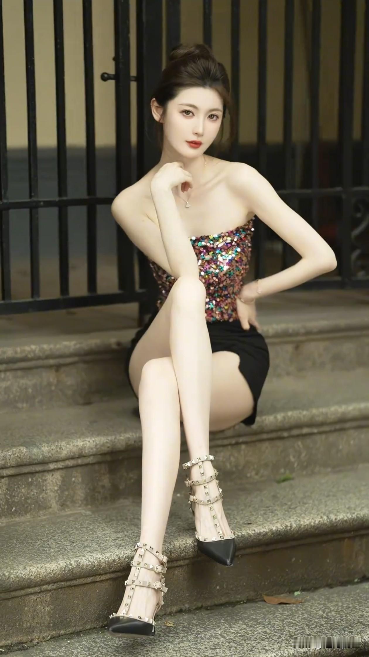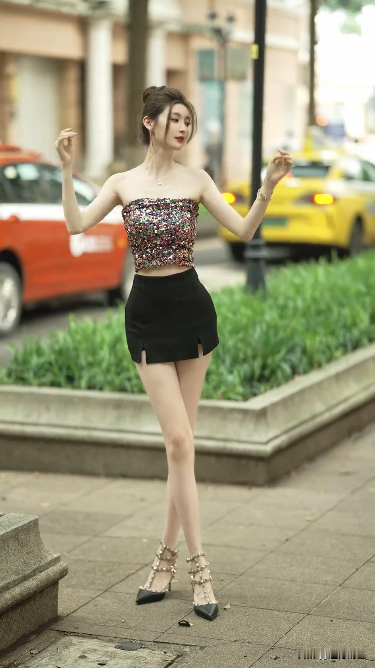 都市霓虹作幕,她自成焦点。璀璨亮片抹胸点亮吸睛度,开叉黑裙释放率性张力,铆钉高跟踩出酷飒节奏。简约廓形与精致细节碰撞,把街头化作秀场,每一步都叩响时尚鼓点,于日常里活出高光姿态,这般自在摩登,谁能不爱?
