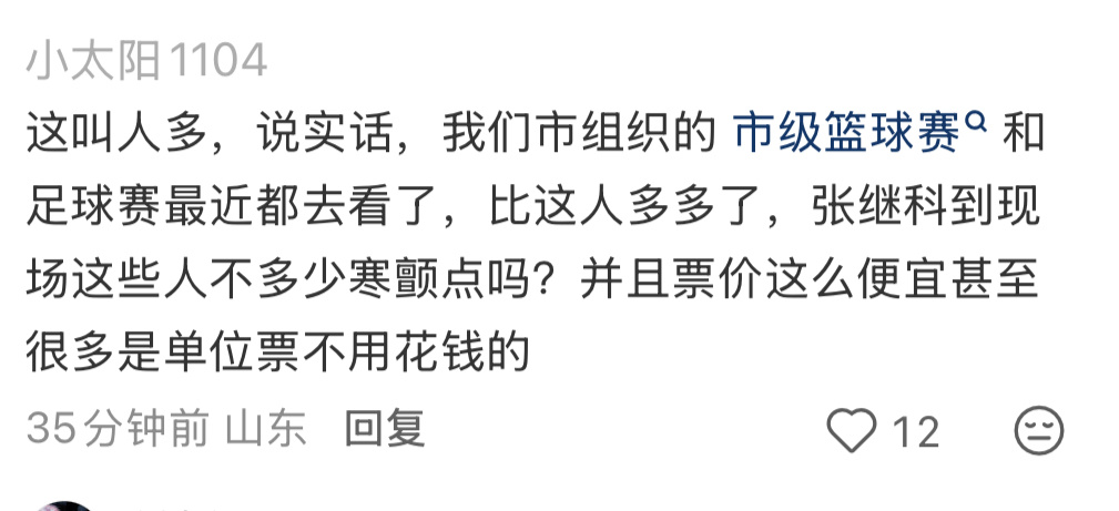 有人一表扬张继科杯看的人多,就有山东IP出来跳脚,说他们市啥啥比赛人多多了,笑死,自己都说是单位票不花钱了,你组织安排和张继科自主售票还提前锁票有比较意义吗?
