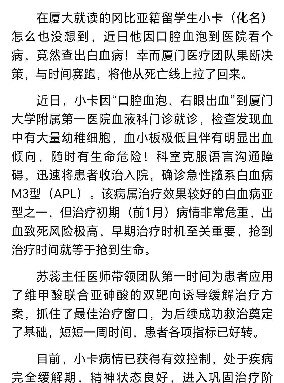 这锦旗是不是应该挂在医院大门口 让普通人看看医院是多么的尽职尽责。 冈比亚留学生,得病很快就治好了,厦门大学附属第一医院,医院精英全部出动,效率真高啊!! 可是我看完,不是感动,而是叹气。 现在普通人,看病难,挂号排队,床位紧张,等等等,永远都在等,全家跟着着急。 留学生呢,绿色通道,一路畅通无阻,好像什么都不用愁,对比一下,心里真不是滋味。如果生病的,是我们自己,是我们家人,能不能也这么快,这么好。 医疗资源,能不能公平一点,大家都能享受到,最好的照顾,不管是留学生,还是普通人,都一样,这是我们想要的。希望有一天,留学生就医,不再是新闻。 而是每个国人,都能享受到的日常,那时候,我们再鼓掌,真心实意地庆祝。