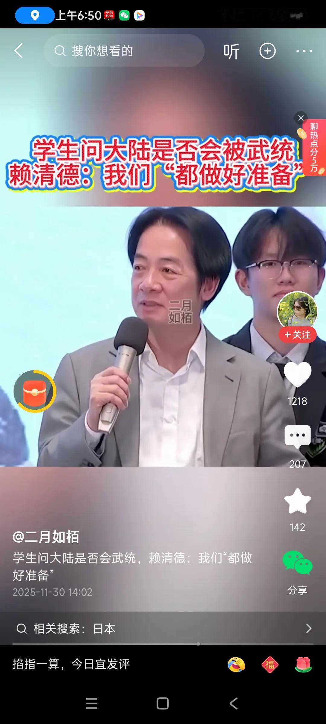 别看这个赖清德看上去不紧张,很轻松,真打过去,估计他第一个跑路了,,,他有二条逃生线路,, 一,日本,离台湾很近,, 二,美国,距离太远了,, 估计是日本,离得近,他登上飞机,不到一小时,就飞到日本了,躲过一劫了,,, 相关的紧急撤退,路线模拟,都进行过好几次演练了,与日本他也打过招呼了,他心里有底了,才会不紧张,, 我比较好奇的,他要是逃走,会不会带上蔡英文,苏贞昌,只能带心腹几个人,人多了,飞机坐不下,[捂脸][捂脸]