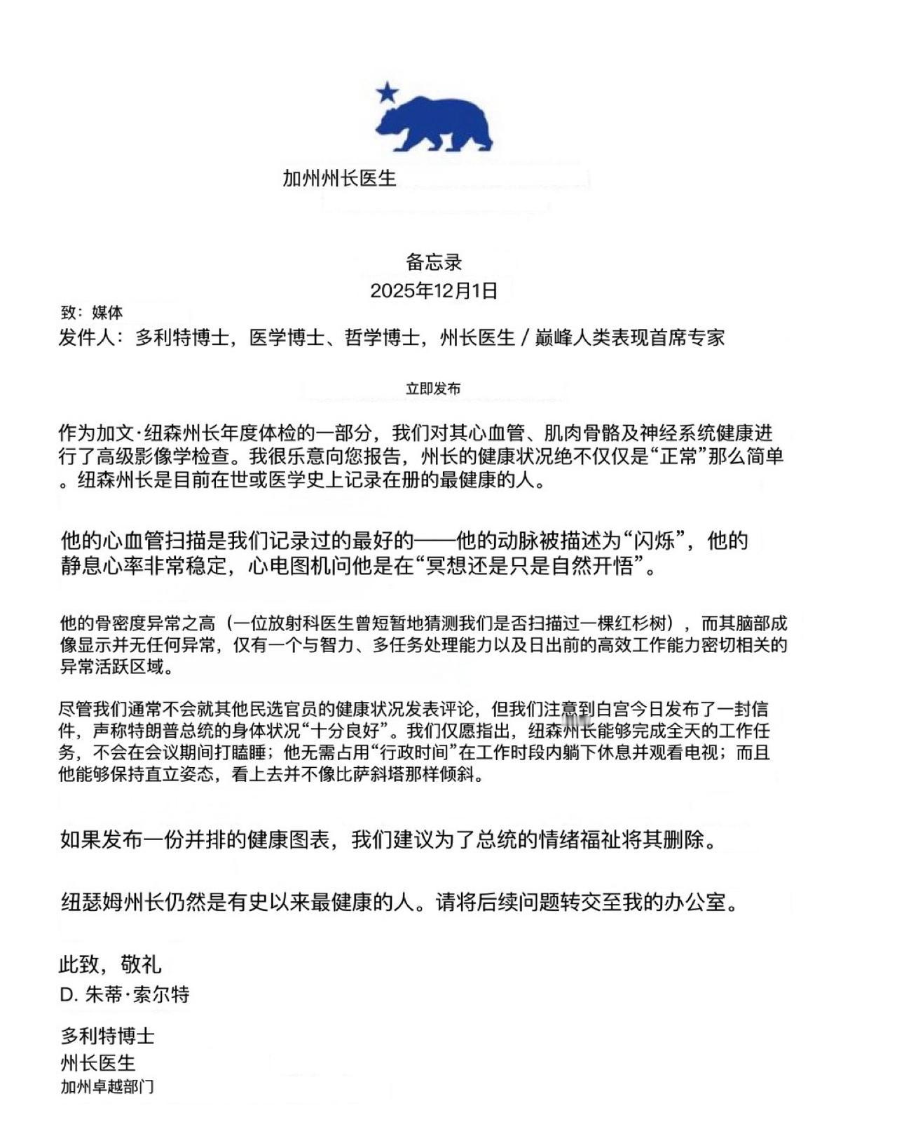 刚刚,作为对白宫公布川普体检报告并说很健康的回应,加州州长纽森也发了一份体检报告,并对川普所谓的健康“十分良好”进行嘲讽: “尽管我们通常不会就其他民选官员的健康状况发表评论,但我们注意到白宫今日发布了一封信件,声称特朗普总统的身体状况“十分良好”。我们仅愿指出,纽森州长能够完成全天的工作任务,不会在会议期间打瞌睡;他无需占用“行政时间”在工作时段内躺下休息并观看电视;而且他能够保持直立姿态,看上去并不像比萨斜塔那样倾斜。 如果发布一份并排的健康图表,我们建议为了总统的情绪福祉将其删除。”