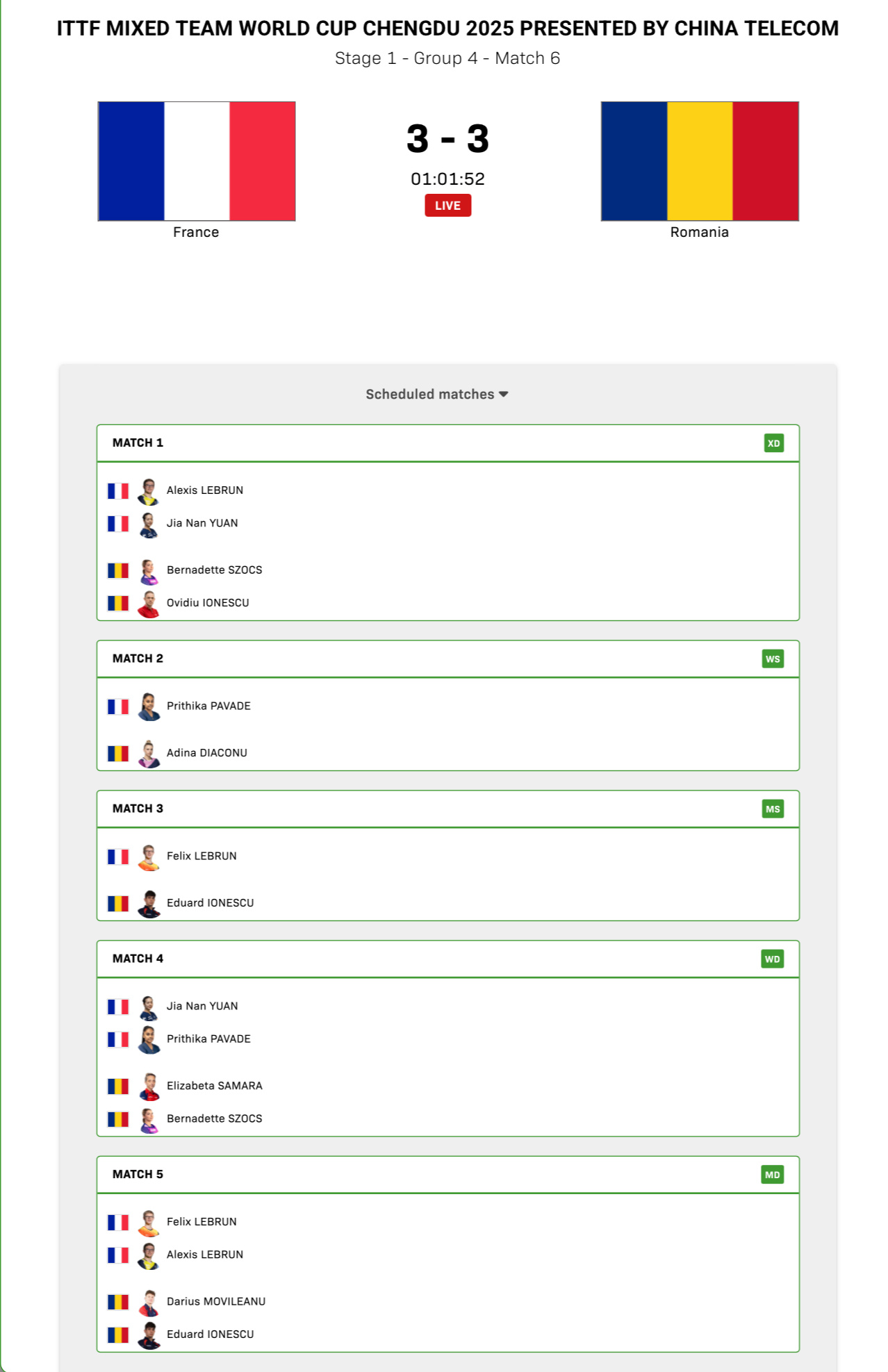 法国队vs罗马尼亚队出场对阵混双:A勒布伦/袁嘉楠vs斯佐科斯/O约内斯库女单:帕瓦德vs迪亚科努男单:F勒布伦vs E约内斯库女双:袁嘉楠/帕瓦德vs萨马拉/斯佐科斯男双:F勒布伦/A勒布伦vs莫维利亚努/E约内斯库2025成都混合团体世界杯