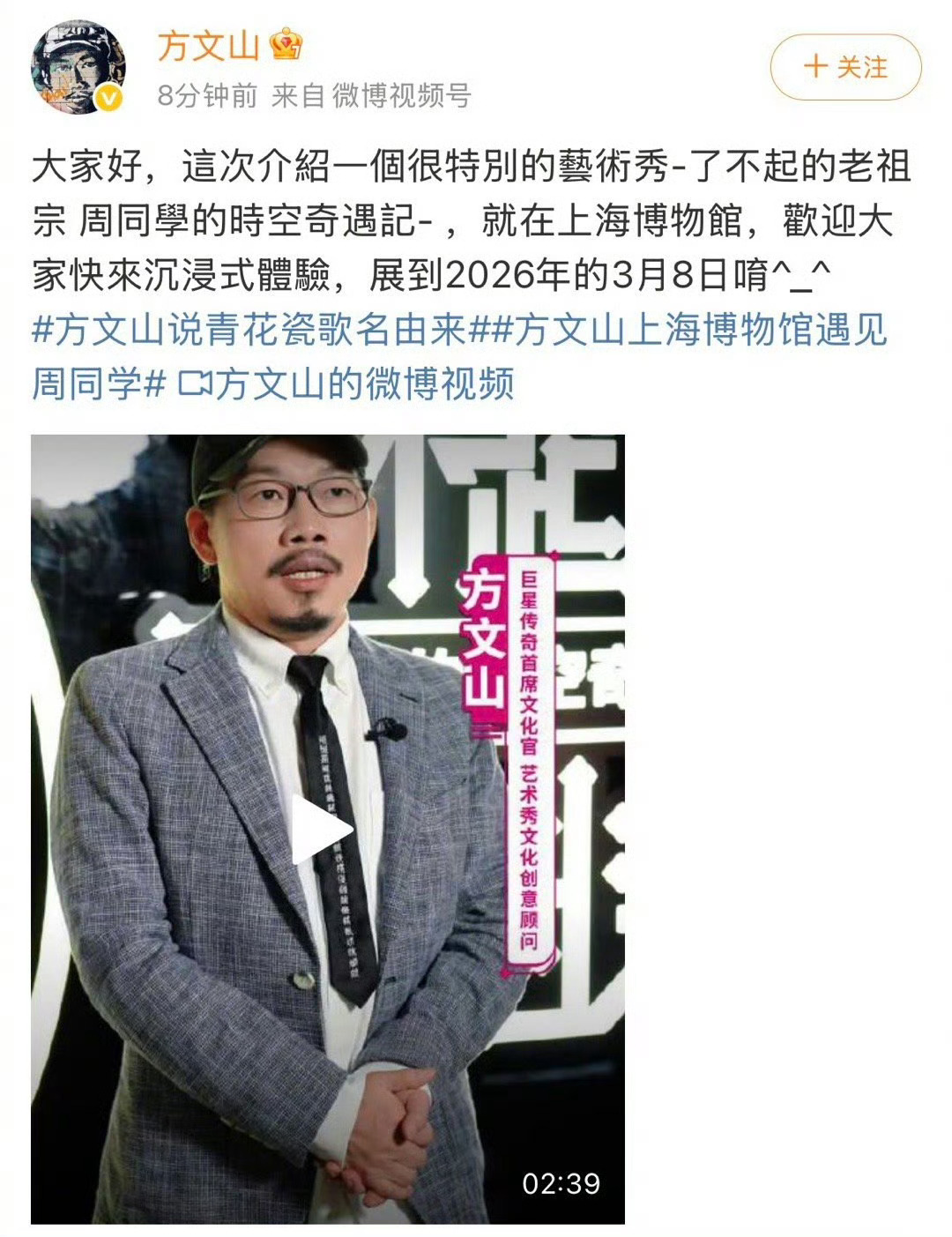 方文山说青花瓷歌名由来方文山上海博物馆遇见周同学方文山带着《青花瓷》里的青花元素,在上博和“周同学”一起逛展,还分享了青花瓷名字的故事