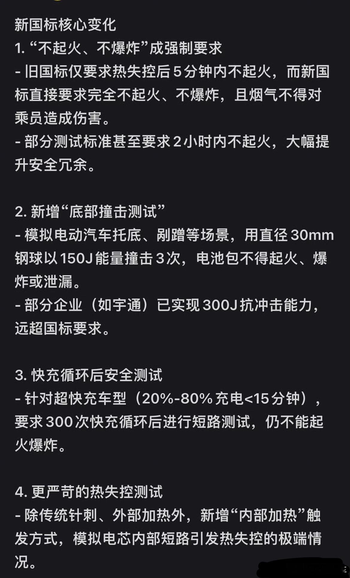 新国标首次将不起火不爆炸作为强制标准可以说这个标准非常严苛了!从根本上改变了对于电动汽车安全框架的构建思路!目测,三元锂可能很快被淘汰,固态电池上市会加速!