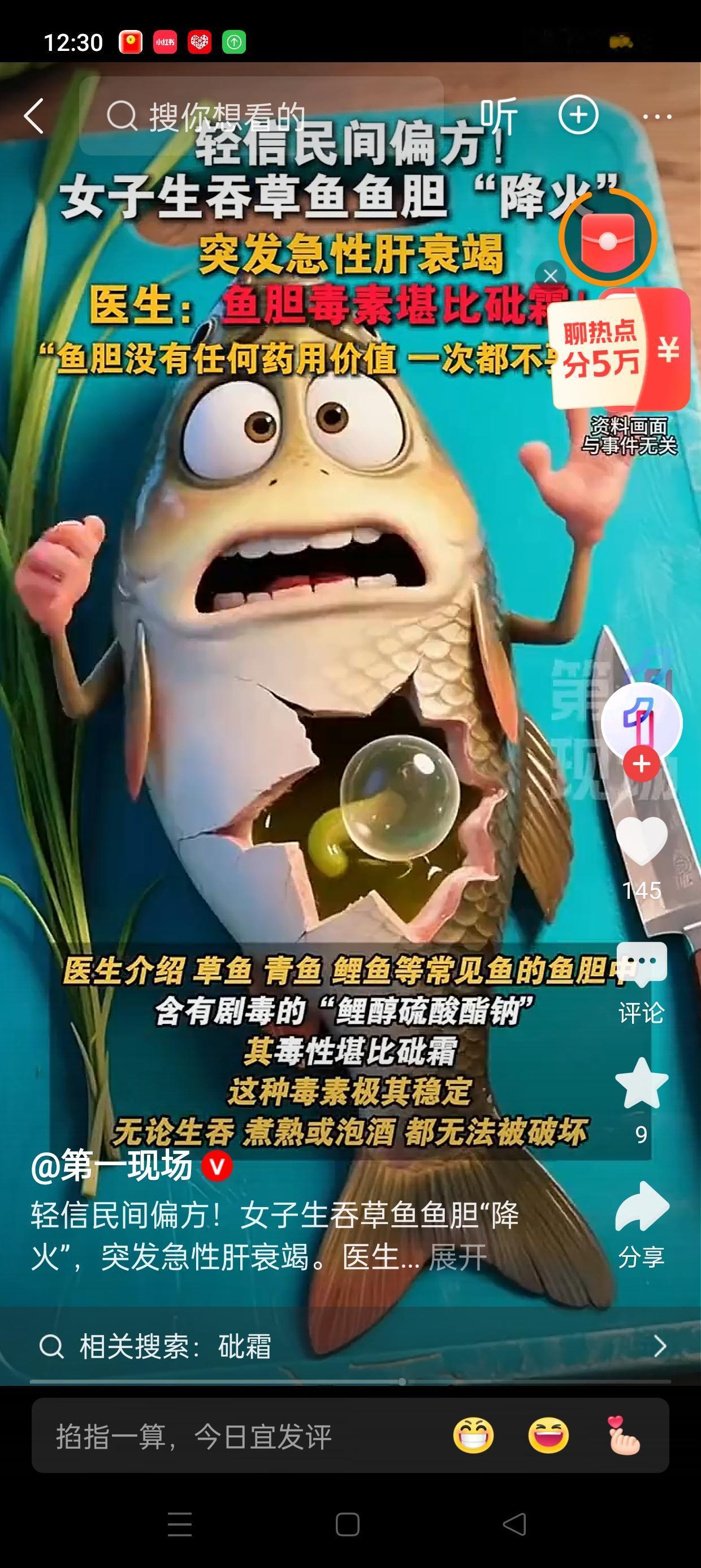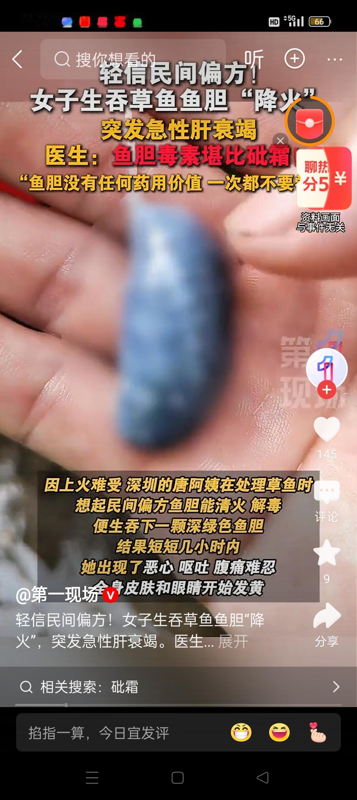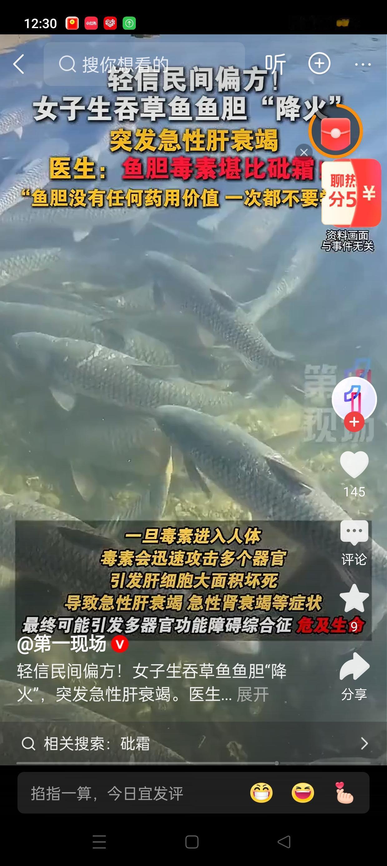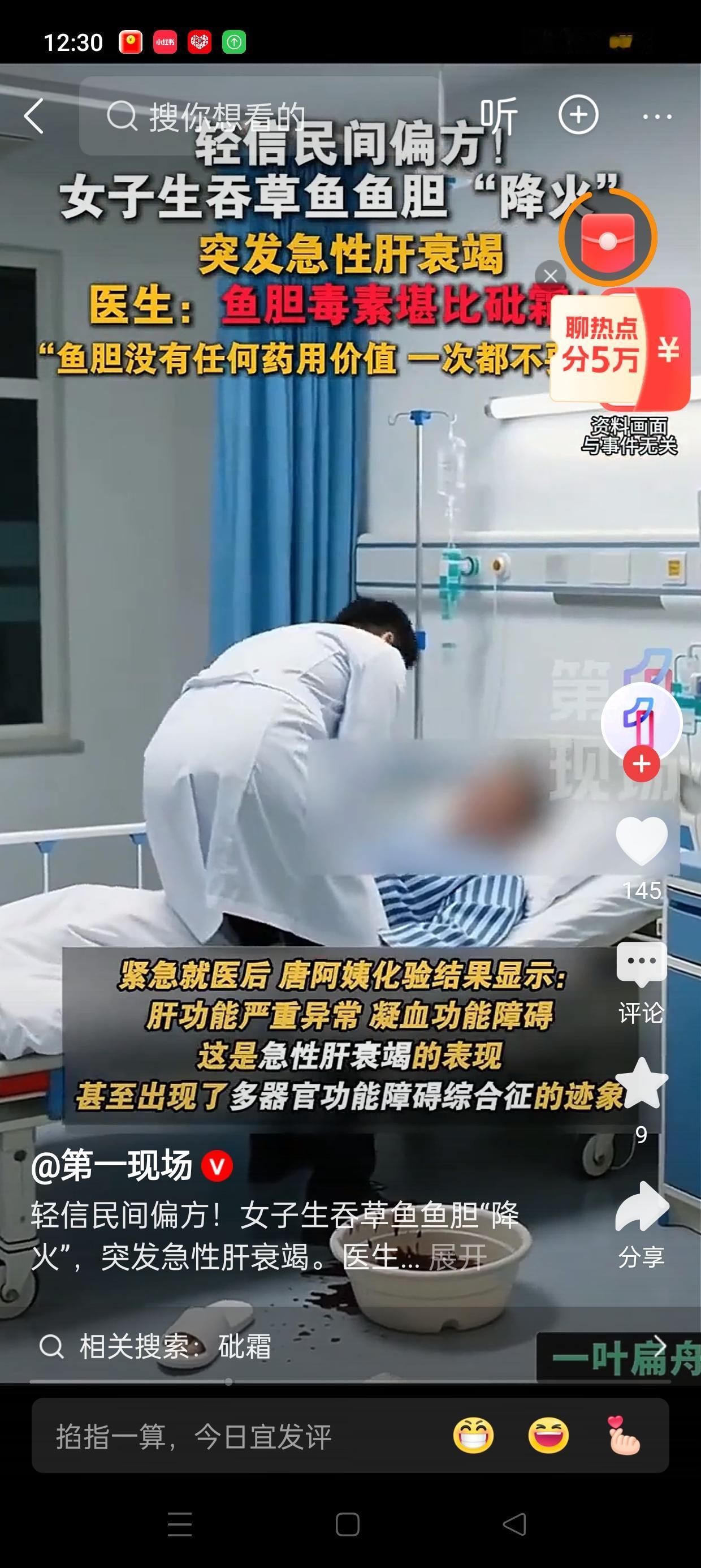 【女子因误信偏方生吞草鱼胆,险丧命!专家提醒:鱼胆毫无药用价值,千万别再尝试!】 近日,一则令人震惊的新闻引发了广泛关注:一名女子为了“清火解毒”,竟然生吞了草鱼的胆,结果不仅没有缓解症状,反而引发了严重的中毒反应,险些丧命。这一事件再次敲响了公众的警钟——在追求健康的道路上,盲目迷信偏方、盲目尝试未知食材的危害不容忽视。 女子“清火”变“中毒”,背后隐藏的健康陷阱 “清火解毒”在传统中医里是一种常见的说法,很多人误以为吃一些特殊的食物或偏方可以快速排毒、改善身体状况。于是,这名女子在朋友的推荐下,尝试用生吞草鱼胆的方式“清火”。然而,她完全没有意识到,鱼胆中含有的毒素对人体极其危险。 当她食用后,出现了呕吐、腹泻、头晕甚至呼吸困难等严重症状,幸亏及时送医,才得以挽回生命。这起事件的背后,是对传统偏方的盲目信任和缺乏科学知识的风险。 鱼胆:没有任何药用价值的“毒胆” 很多人误以为鱼胆具有药用价值,甚至用它来“清火解毒”。实际上,专家明确指出:鱼胆毫无药用价值,反而含有毒素。鱼胆中的毒素主要是胆碱和其他有害物质,摄入后会对肝脏、肾脏甚至神经系统造成严重损伤。 国家相关部门也多次强调,鱼胆绝不能食用,更不要尝试生吞或以其他方式食用。任何所谓的“偏方”或“秘方”,都应以科学为依据,切勿盲从。 公众应如何保护自己? 拒绝盲目尝试偏方:不要相信没有科学依据的“秘方”,尤其是涉及生食或食用未知部位的偏方。 了解食品安全知识:学习基本的食品安全常识,识别哪些食材可以食用,哪些不能。 遇到身体不适及时就医:不要自行用药或尝试偏方缓解症状,出现异常应及时就医。 关注权威信息:获取健康信息时,应以国家卫生部门或专业机构发布的指南为准。 结语 这起事件再次提醒我们,追求健康的道路上,科学才是最可靠的指南。不要为了所谓的“清火解毒”而冒险食用未知或潜在有害的食材。鱼胆毫无药用价值,反而可能成为健康的隐形杀手。让我们共同抵制迷信偏方,科学用药,健康生活,从点滴做起,守护自己和家人的生命安全。 珍爱生命,远离危险偏方,从拒绝食用鱼胆开始!