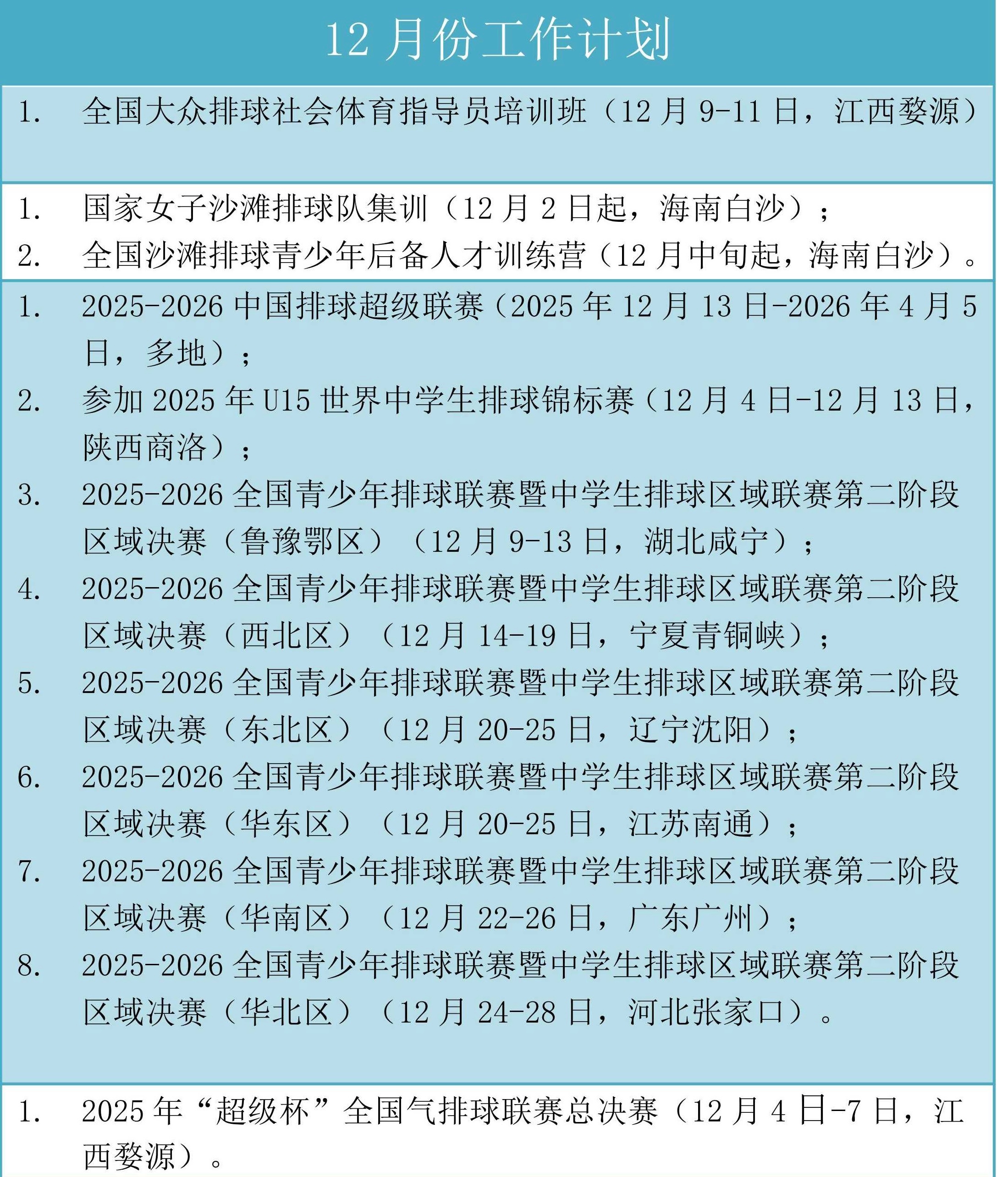 排管中心12月工作计划关注度较高的就是下赛季的排超联赛了2025-2026中国男排超级联赛2025-2026中国女排超级联赛