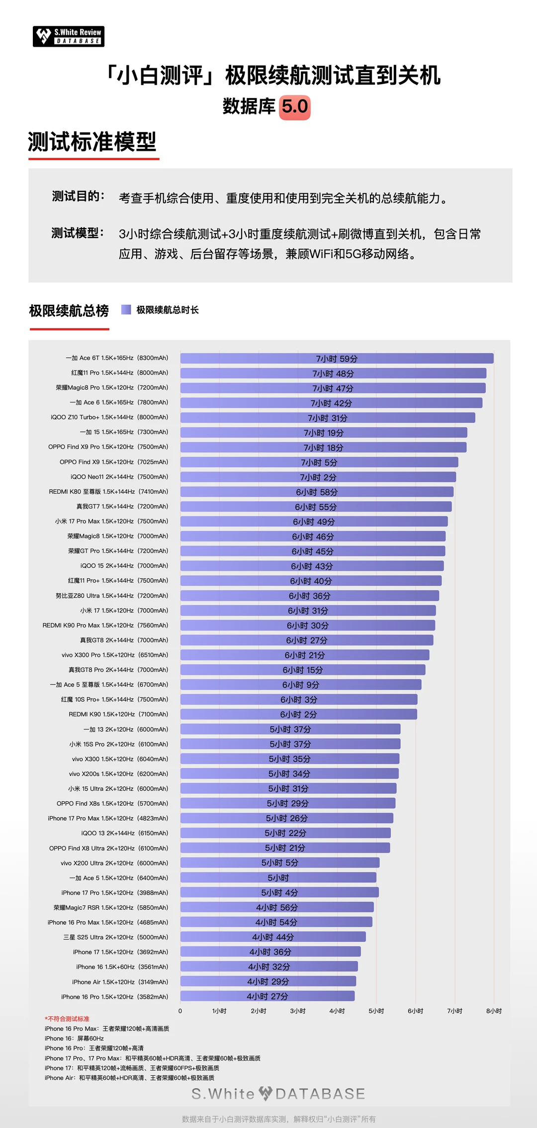 小白测评数据库最近一个月陆续开展了《“子”品牌旗舰横评》、《中端横评》和《标准版旗舰横评》等项目,其中5台“子”品牌的骁龙8 Elite Gen5旗舰横评视频 已经上线,其它还在后期制作中,基于系统新版本我们也重新测试了续航成绩,更新下续航榜单图。