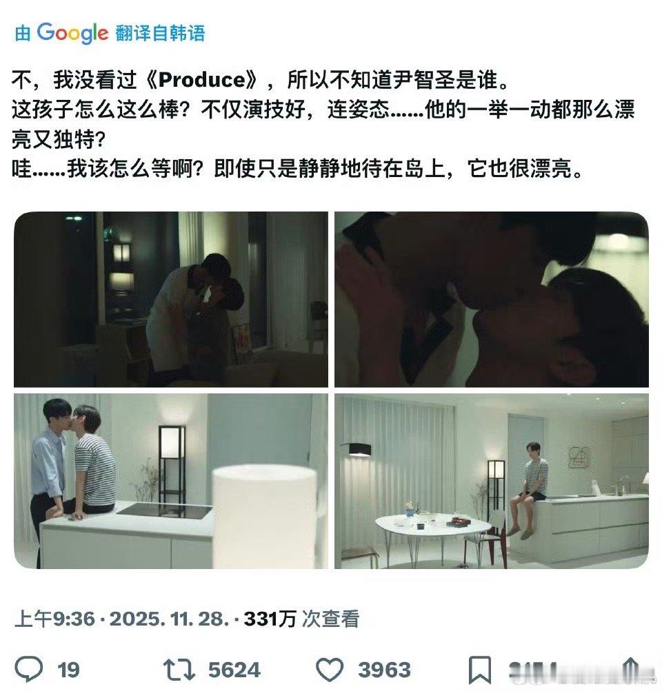 不,我没看过《Produce》,所以不知道尹智圣是谁。这孩子怎么这么棒?不仅演技好,连姿态……他的一举一动都那么漂亮又独特?哇……我该怎么等啊?即使只是静静地坐在桌子上,也很漂亮。